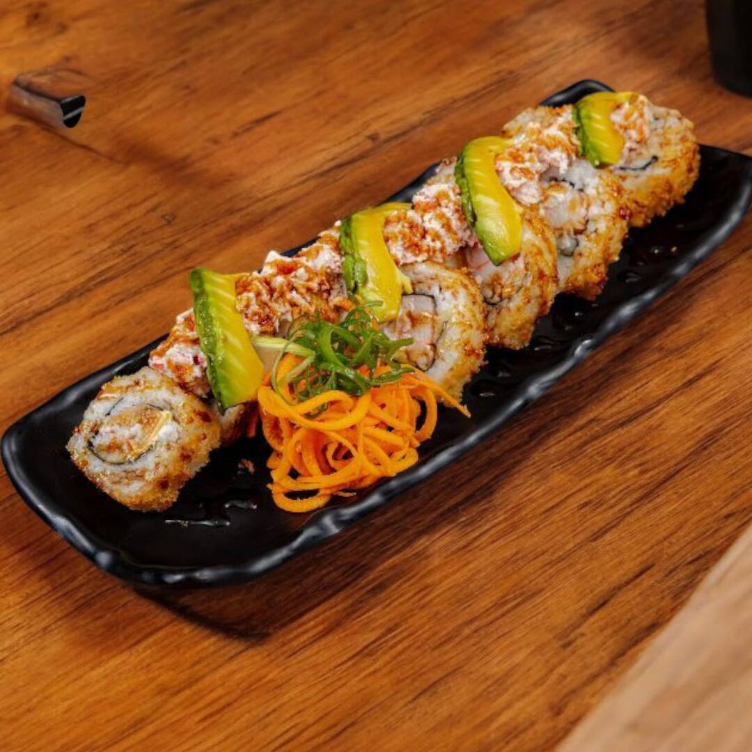 Rollo tempura con el alga por fuera, relleno de Philadelphia, aguacate y camarón empanizado por dentro, con un topping de pulpo empanizado y cebollín, bañado en nuestra salsa especial de menta y un toque de salsa de anguila.