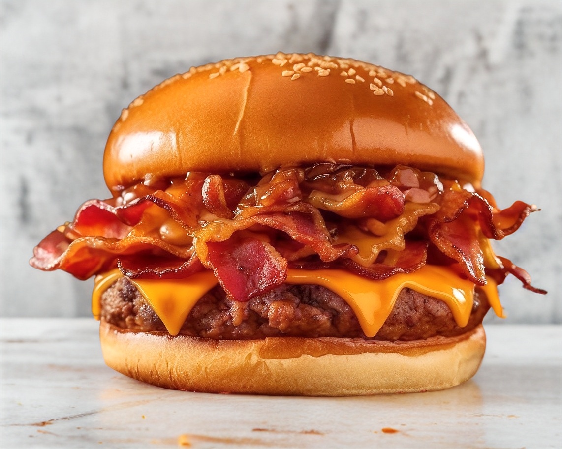 carne artesanal chef, tocineta, quesos, variedad de aderezos presentada a la imagen