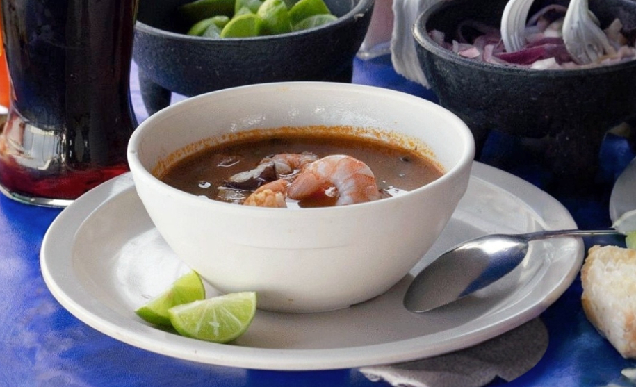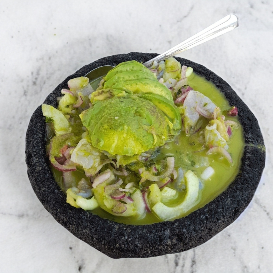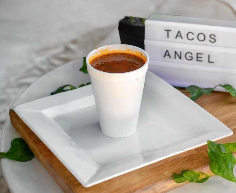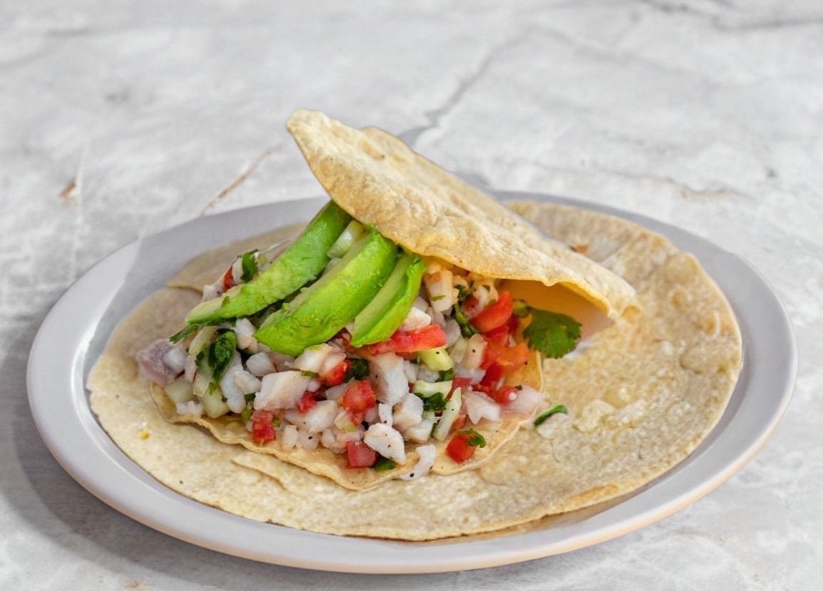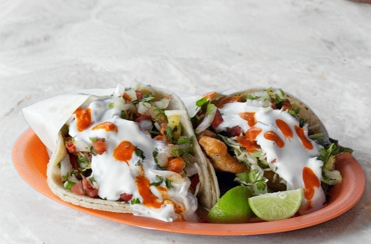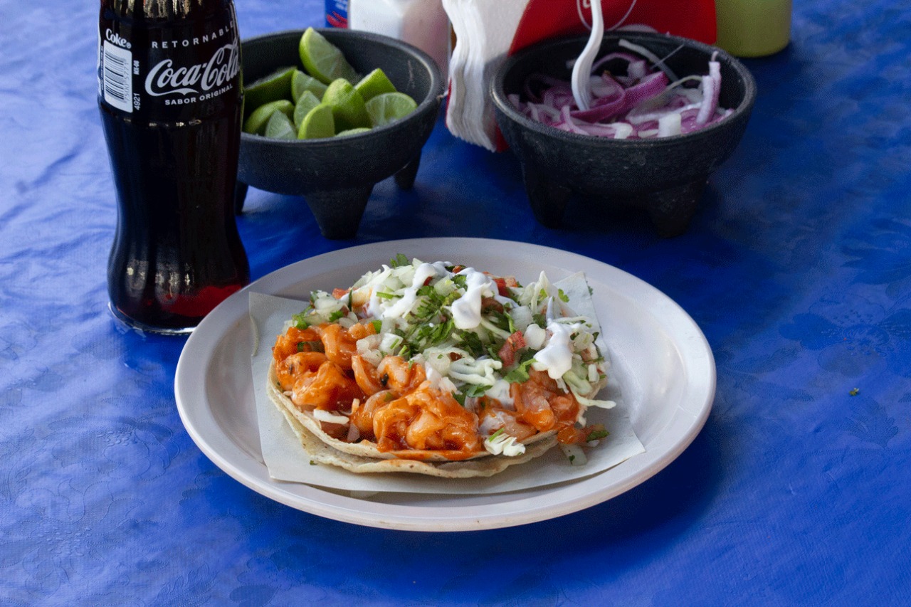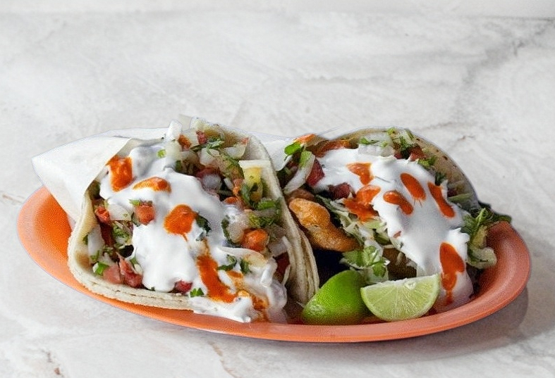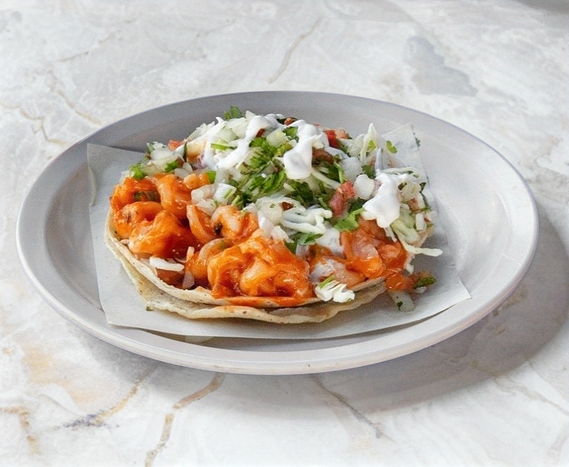 tortilla de maíz ,Queso,camarón enchilado, repollo, salsa bandera, aderezo