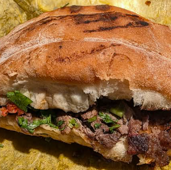 Torta individual en pan telera con una porción de mayonesa y carne asada de res, que puede incluir cebolla, salsa, aguacate y cilantro dentro de la torta. 🥪🔥