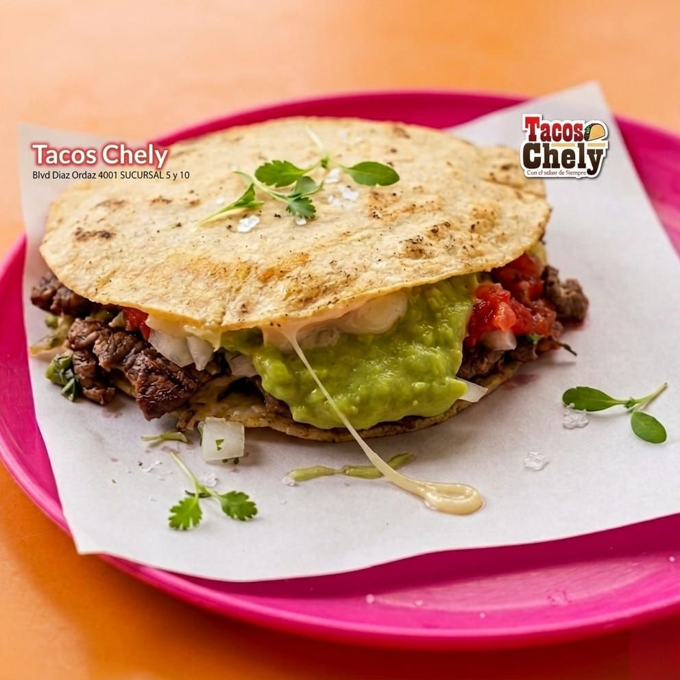 Dos tortillas de harina con queso en medio 2 tipos de carne asada o afibada o chorizo lo que puede llevar es aguacate salsa cebolla cilantro