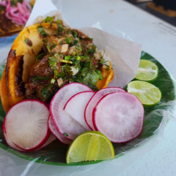 Taco de birria de res con tortilla de maíz, incluye cilantro, cebolla morada, rábanos, limón y salsa
