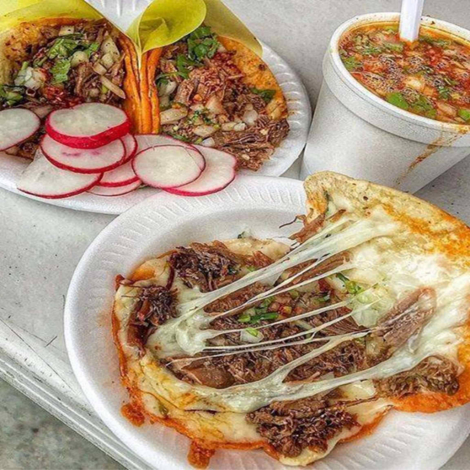2 Quesabirrias de harina, agua de jamaica de 500 MLL con un consomé de 8 Oz, las verduras vienen por separado (cilantro, cebolla morada, rábanos, limón y salsa)