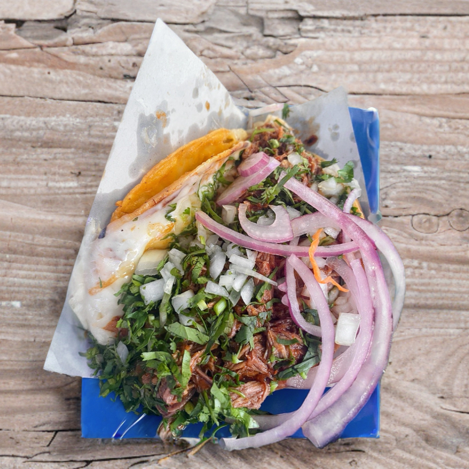 Tortilla dorada con queso derretido y birria, acompañada de un delicioso consomé.