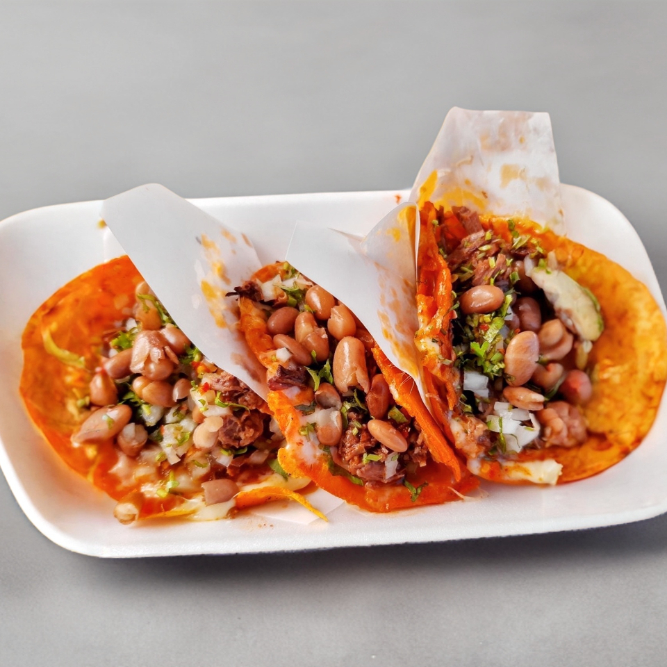 Cilantro, cebolla y frijol. Salsa aparte. Incluye un consomé de 8 oz.