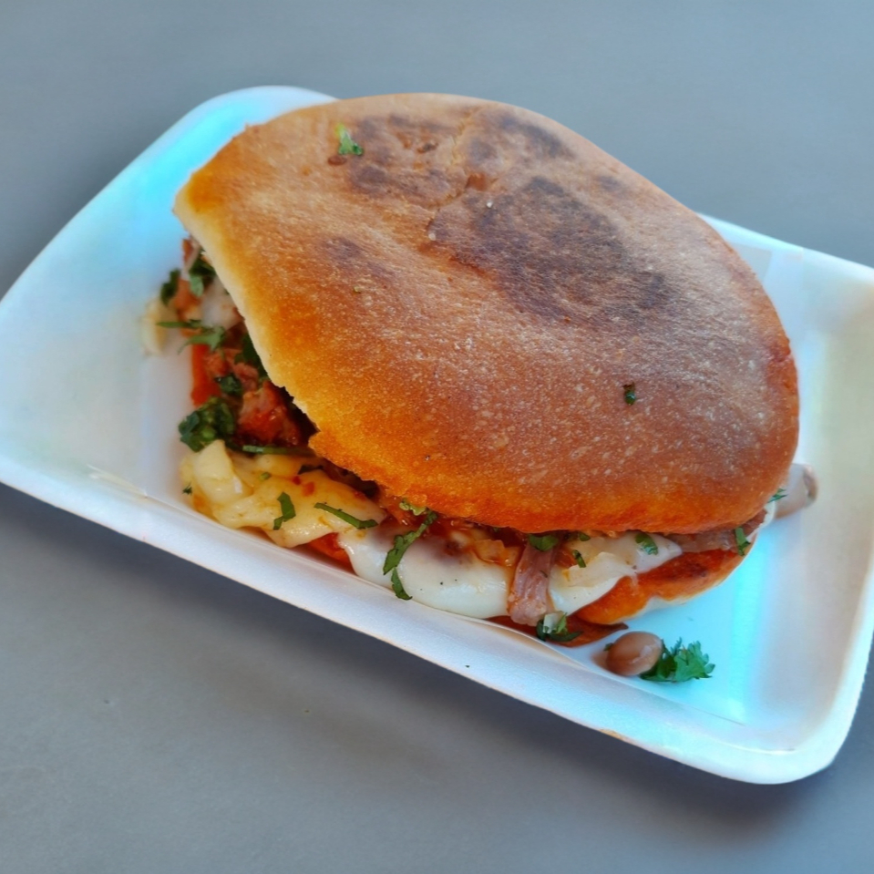 Doble tortilla en forma de mulita con queso mozzarella y birria, preparado con cilantro, cebolla y frijol. Salsa Aparte.
