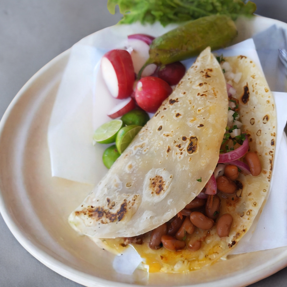 Taco con tortilla de queso mozzarella, cilantro, cebolla y frijol. Salsa aparte.