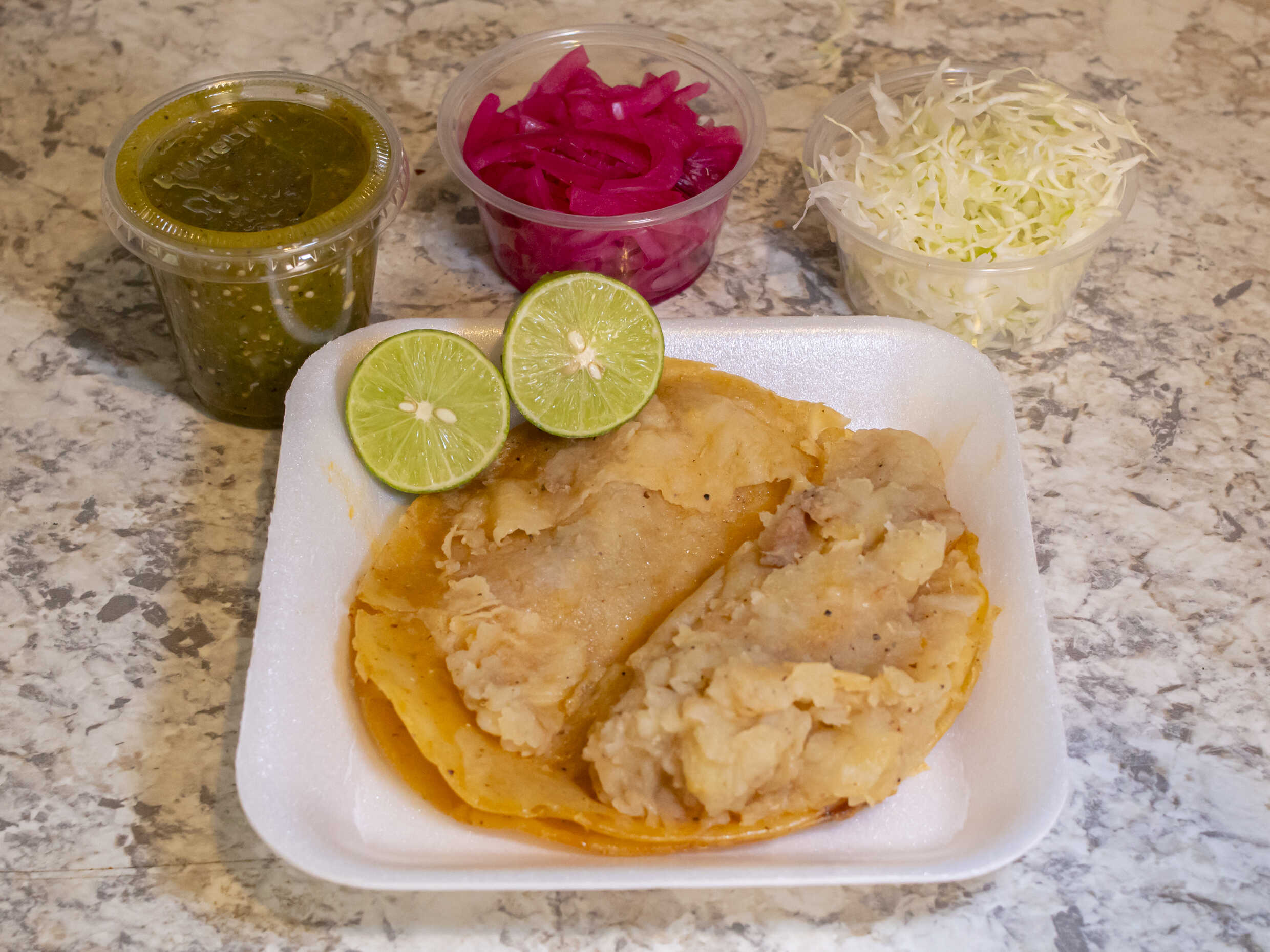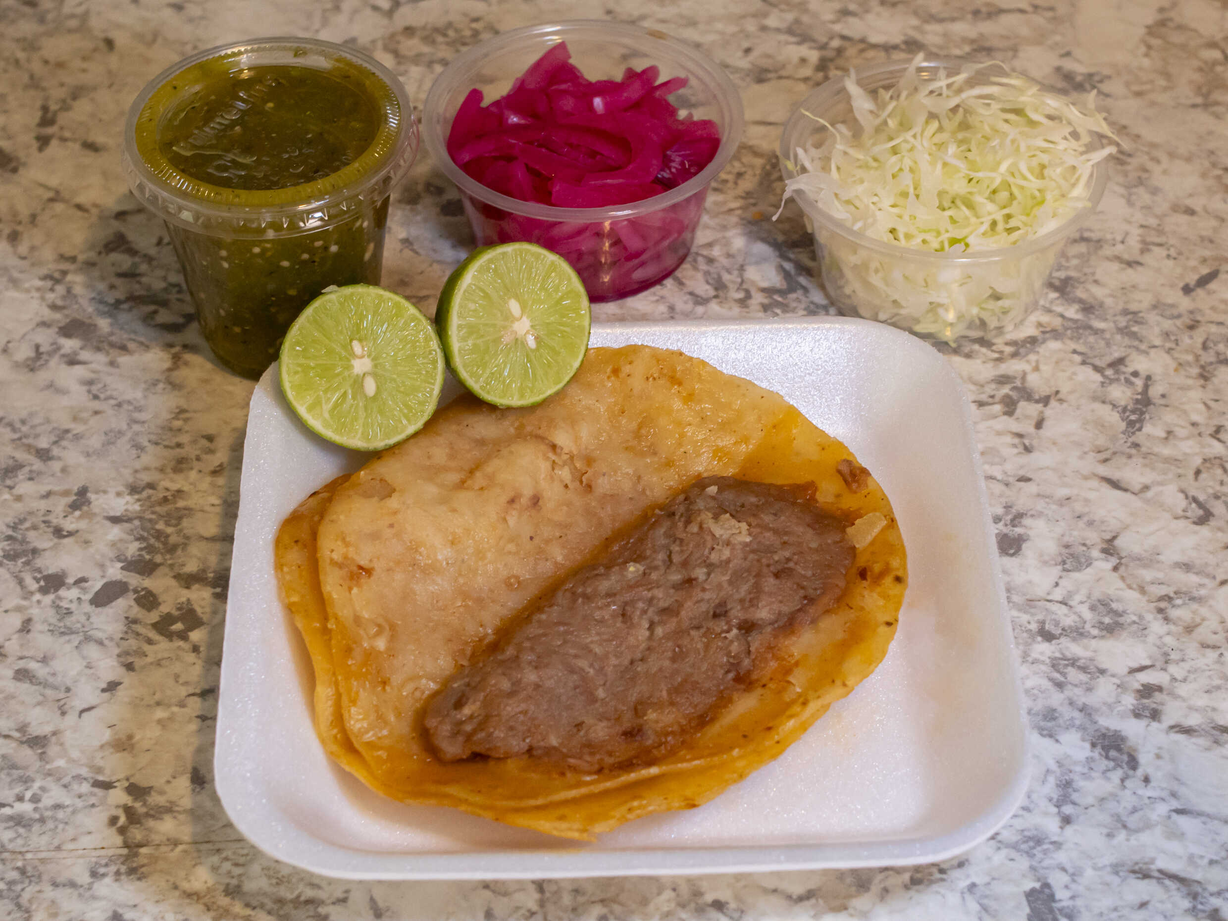 Adjunto: salsa verde, cebolla morada curtida, repollo, limón.