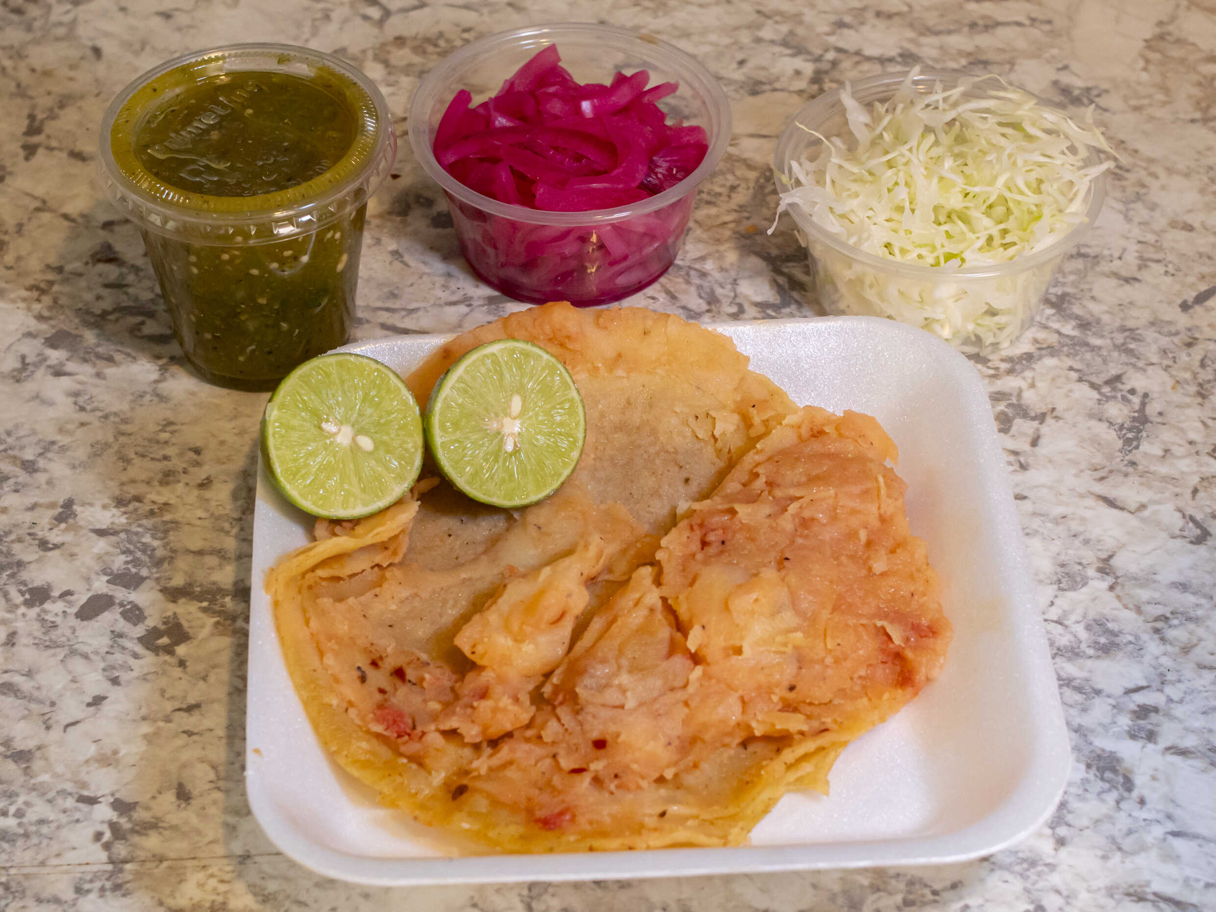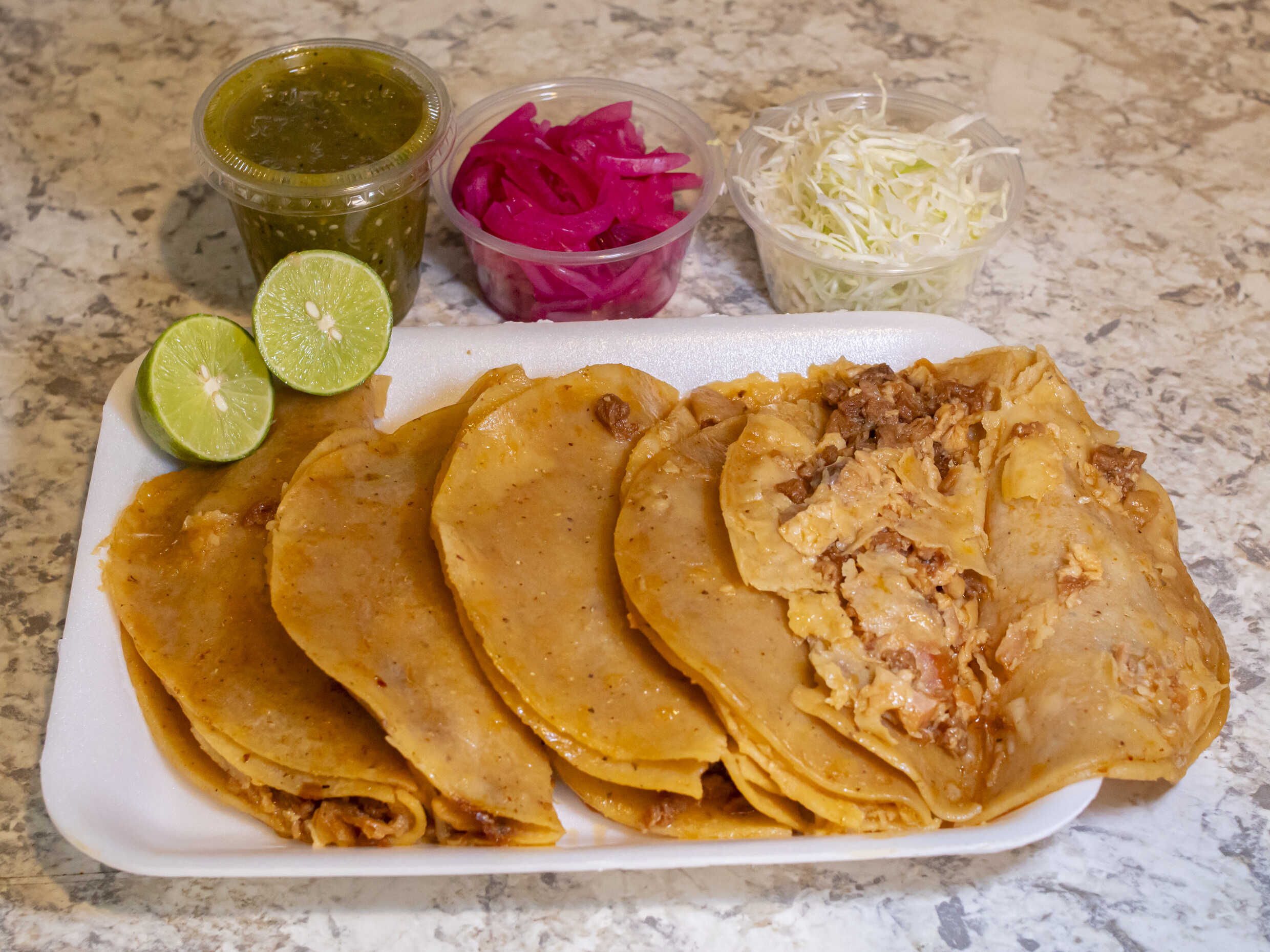 Adjunto: salsa verde, cebolla morada curtida, repollo.