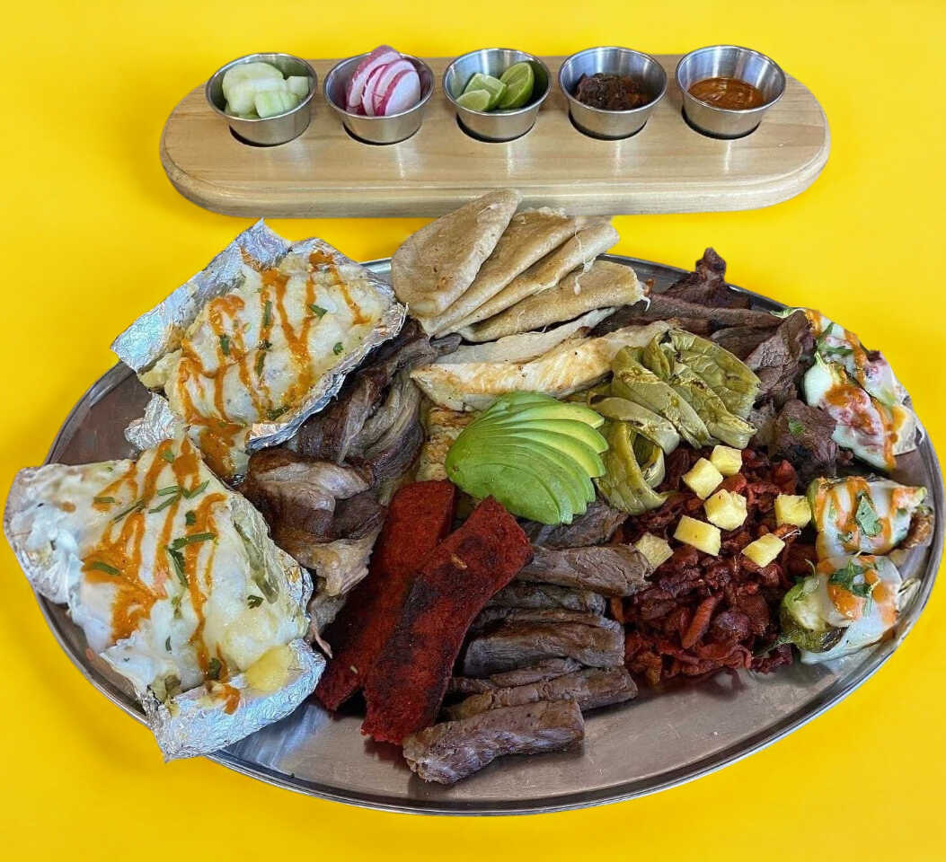 El favorito! 1/2 kg asada, 1/2 kg pastor, 1 papa sencilla, 12 tortillas hechas a mano, salsa de aguacate, chiles asados y chile de árbol, cebolla, chile y nopal asado, pepino, limón y rábano. (recomendado para 3-4 personas)