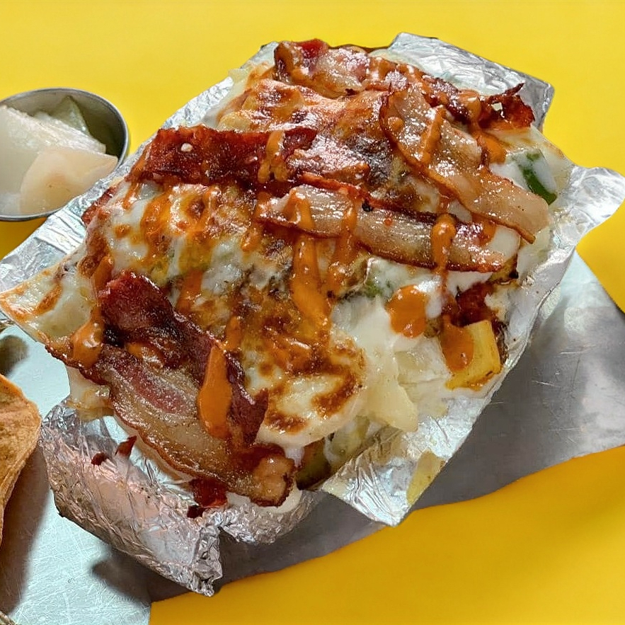 Porque no somos solo tacos! Deliciosa carne preparada en casa, tocino, jamón, queso, piña, tomate, cebolla. Acompañada de papas fritas.