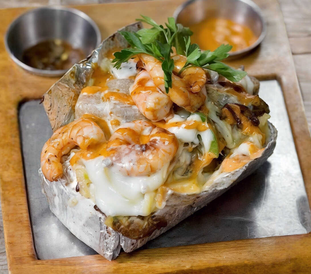 Después de esta, no querrás probar otra papa rellena. 🔥 Mantequilla (receta especial de la casa), crema, chile morrón, cebolla blanca, champiñones, camarones, queso gratinado. Acompañada de tostadas horneadas.