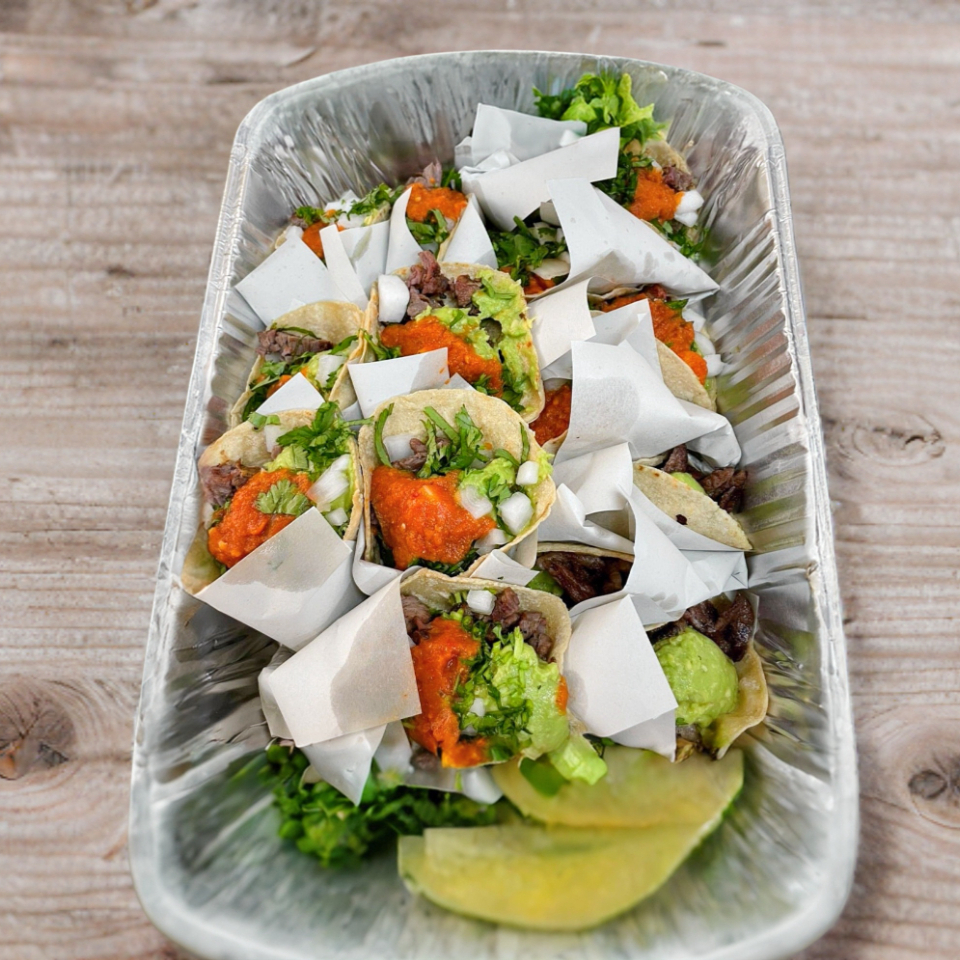 2 kg arrachera ⭐, 1kg pastor . 36 tortillas hechas a mano, 3 salsas de la casa, cebolla, nopal y chiles asados, pepino, limón y rábano.