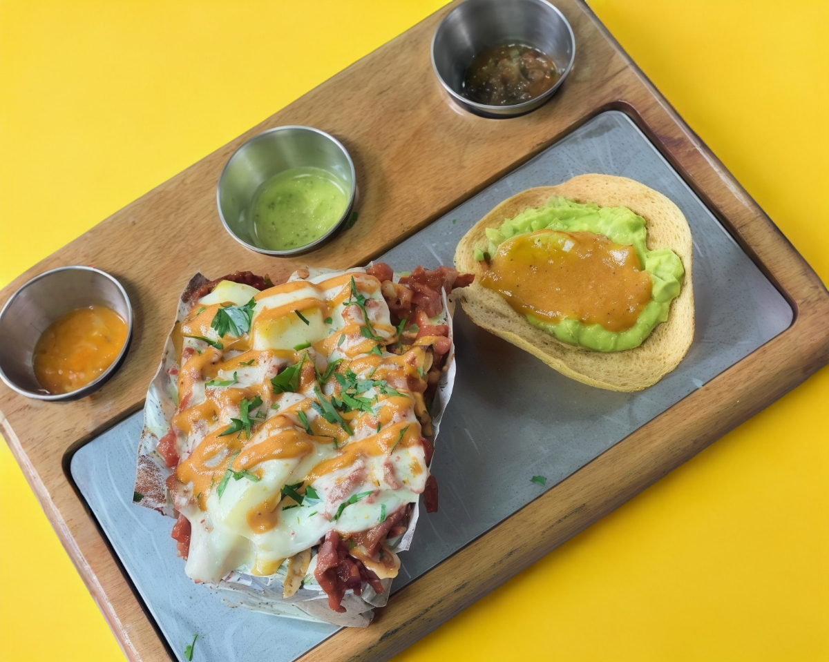 Guacamole, cilantro, cebolla, queso GRATINADO. (asada, pastor, pollo, chorizo