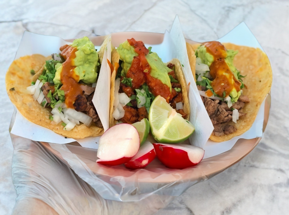 Orden de 3 tacos de carne adobada, porción personal en tortilla doble de maíz con cebolla, cilantro, aguacate, salsa, frijol y bebida de 600 ml según tu elección.