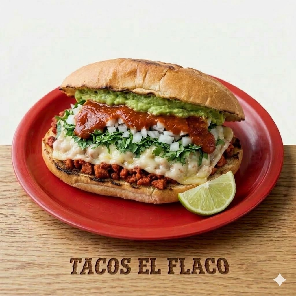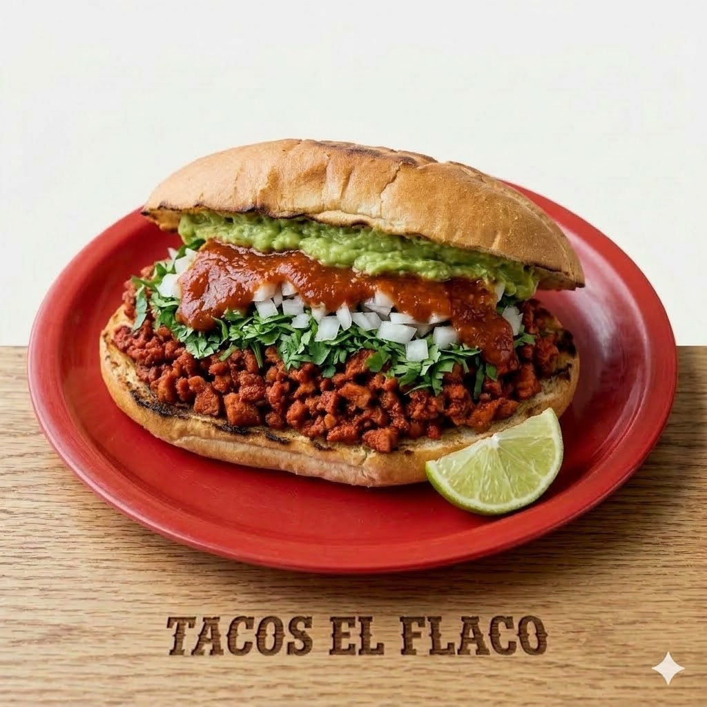 Bolillo calientito con carne a elegir, aguacate, tomate, cebolla y mayonesa.