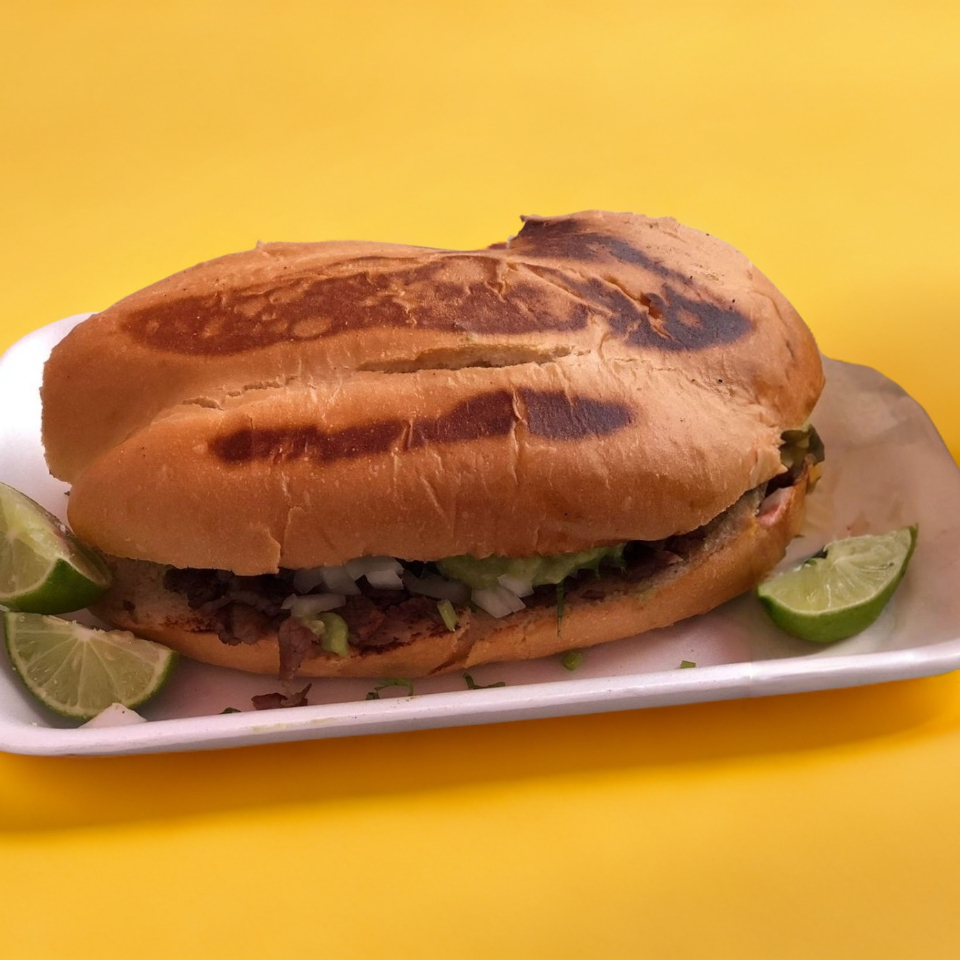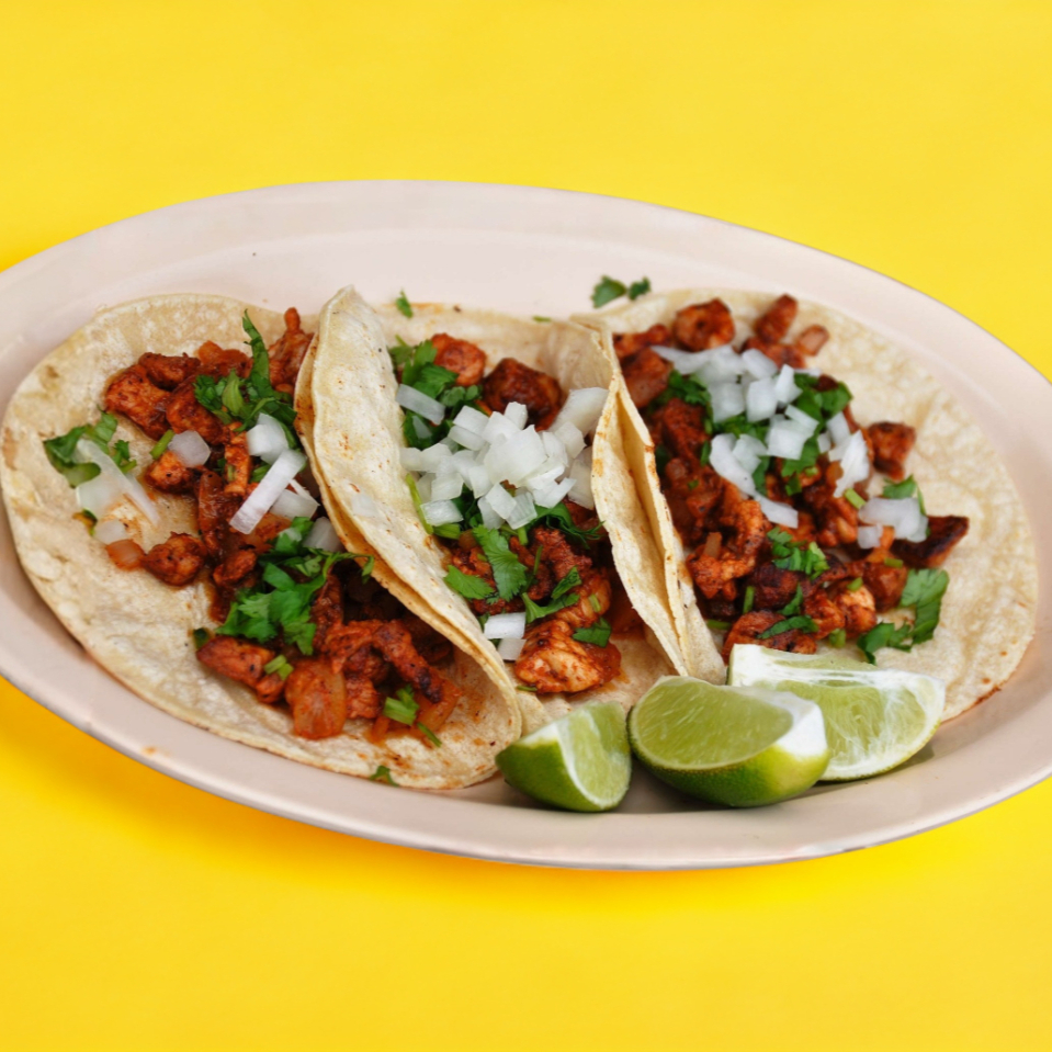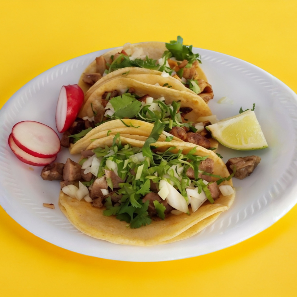 5 tacos en tortilla de maíz recién hecha con carne adobada, cebolla, cilantro, limón, salsa roja y aguacate.