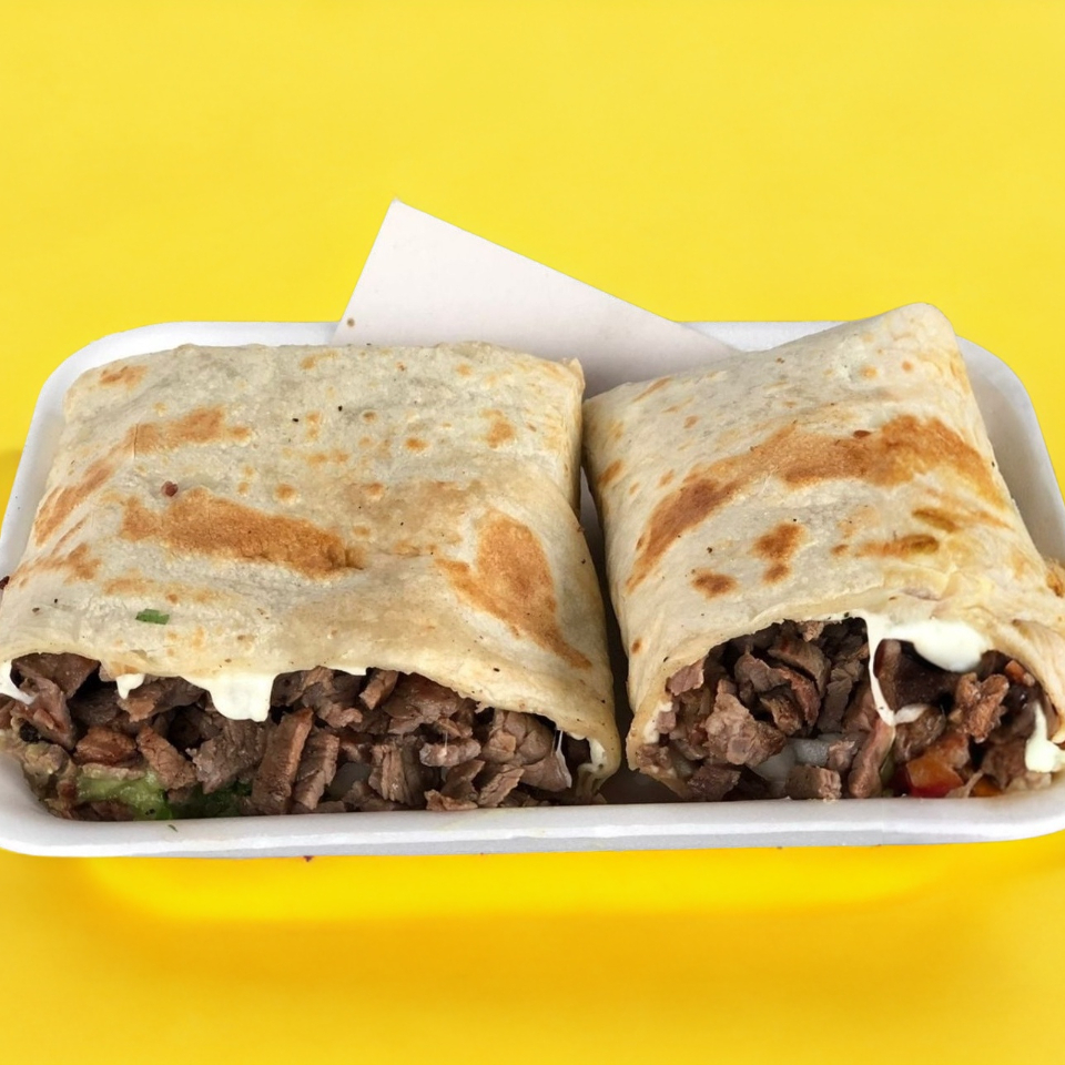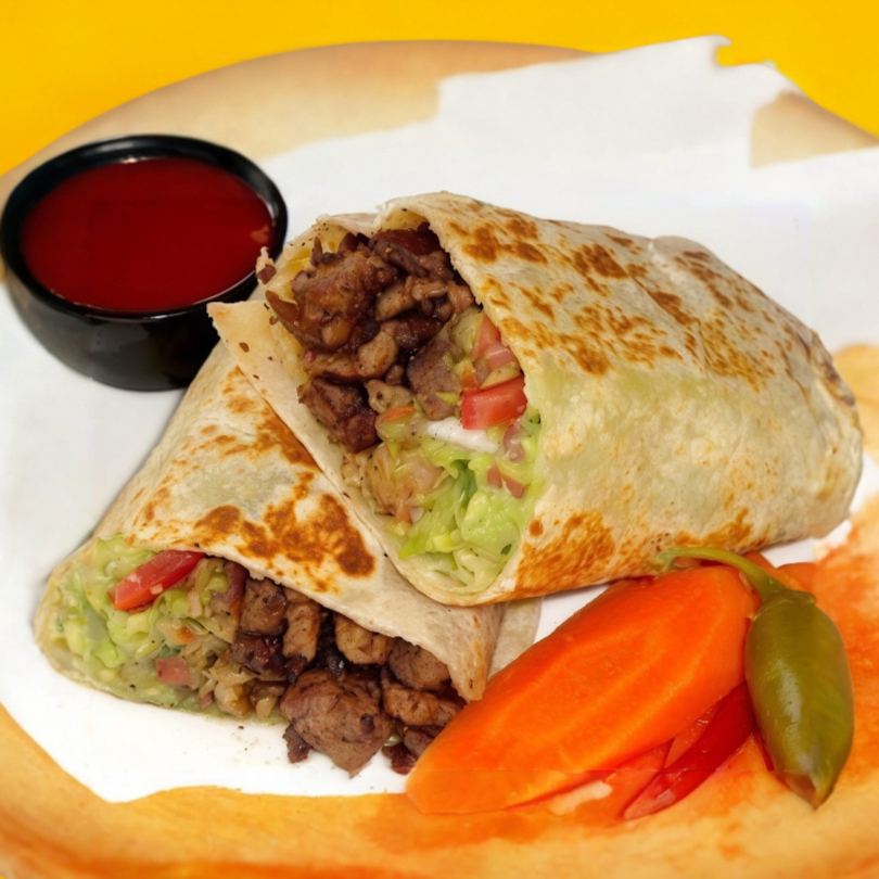 Hecho con tortilla de harina, queso, cilantro, cebolla, salsa y aguacate.