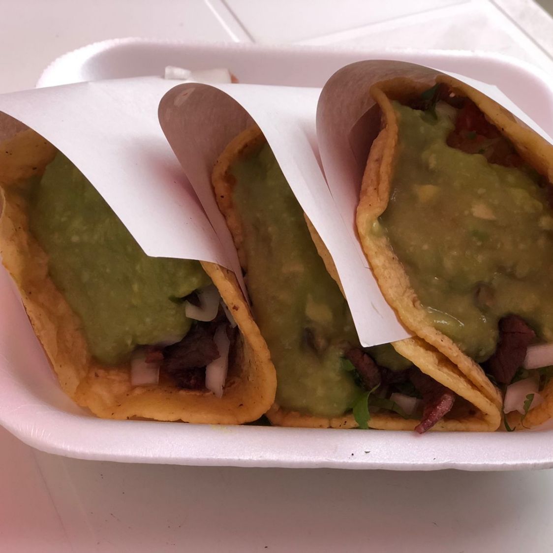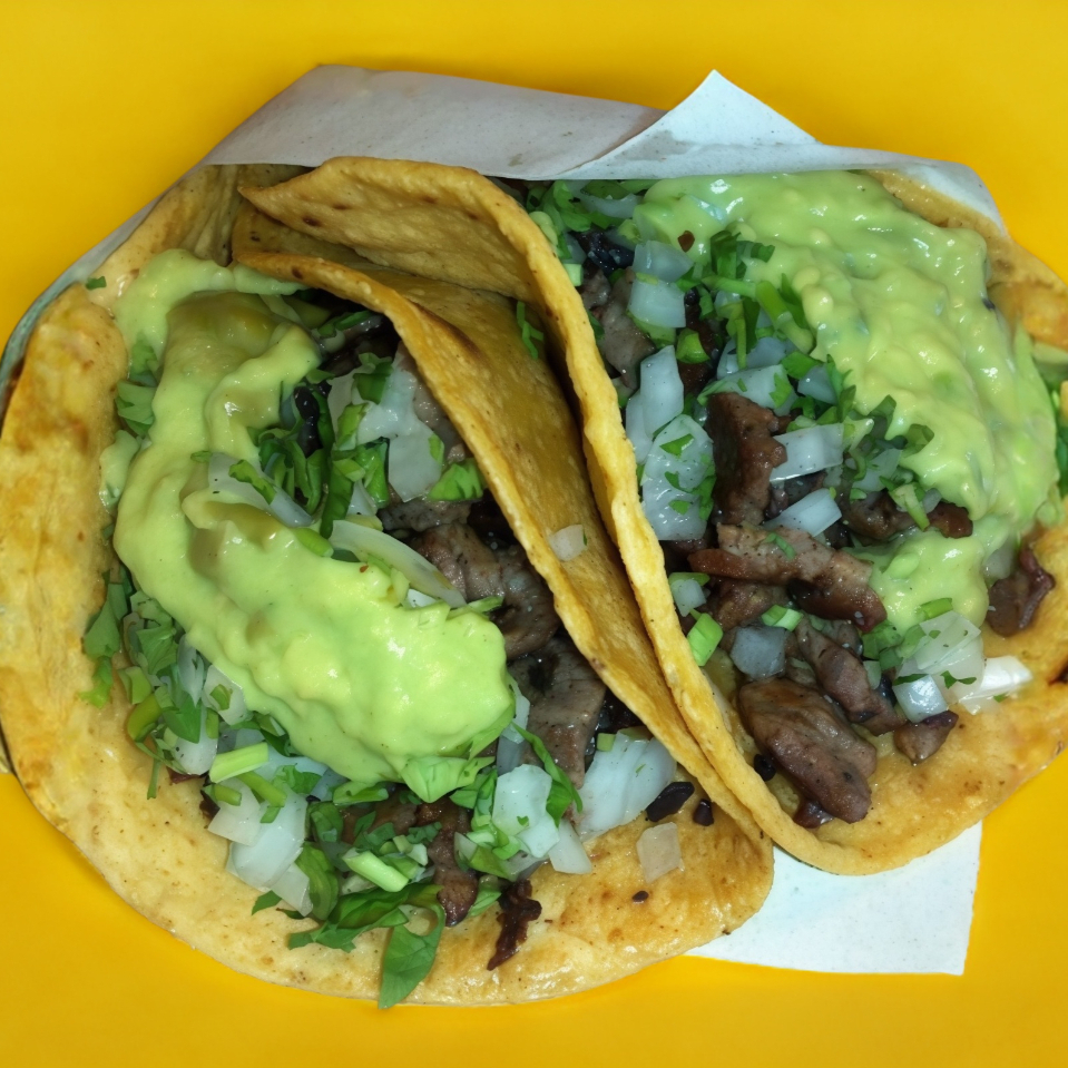 Taco con tortilla de maíz (tortilla recién hecha), asada (una cucharada), cebolla, cilantro, salsa roja y aguacate, a elección para dejar las verduras en el taco o por aparte. Por unidad.