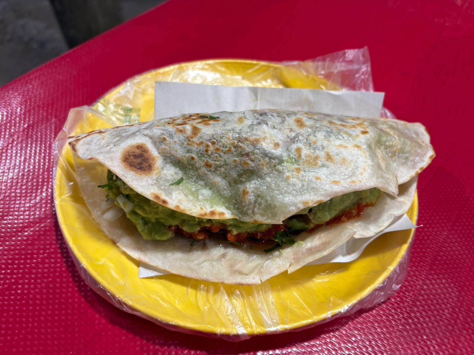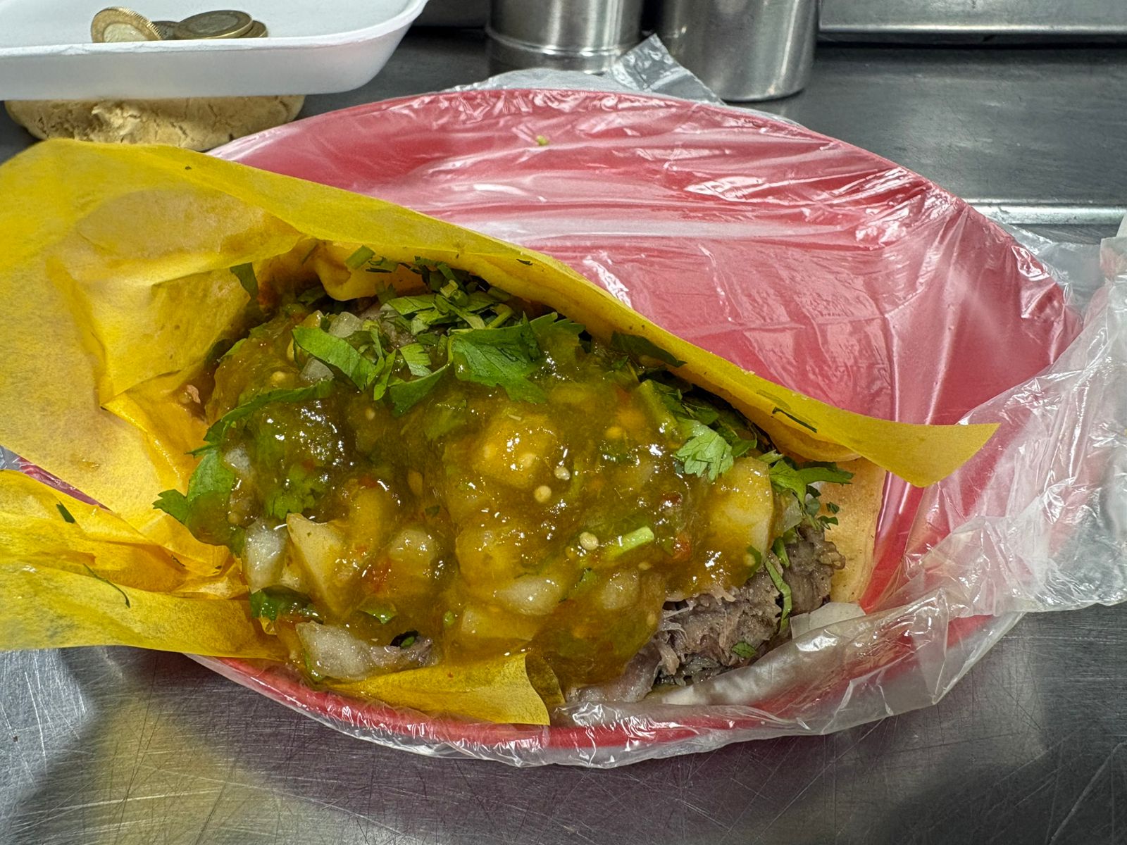 Tortilla de maíz con adobada, cebolla, cilantro y salsa.