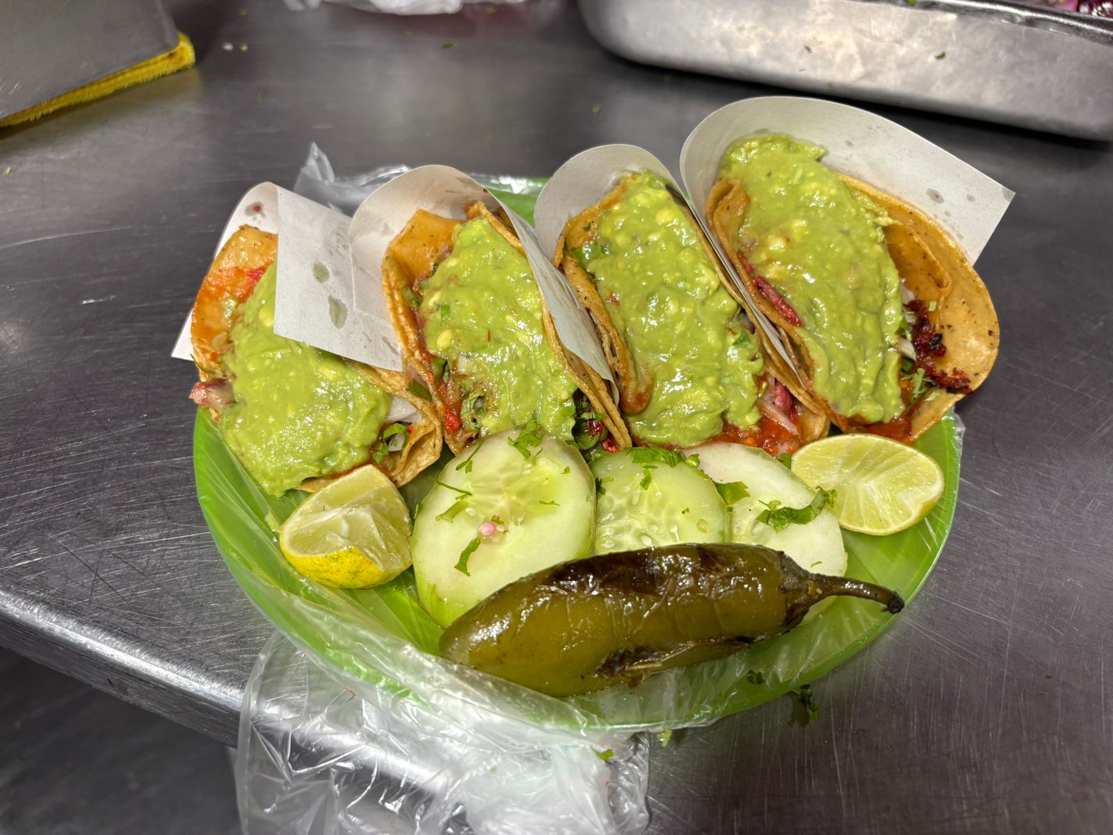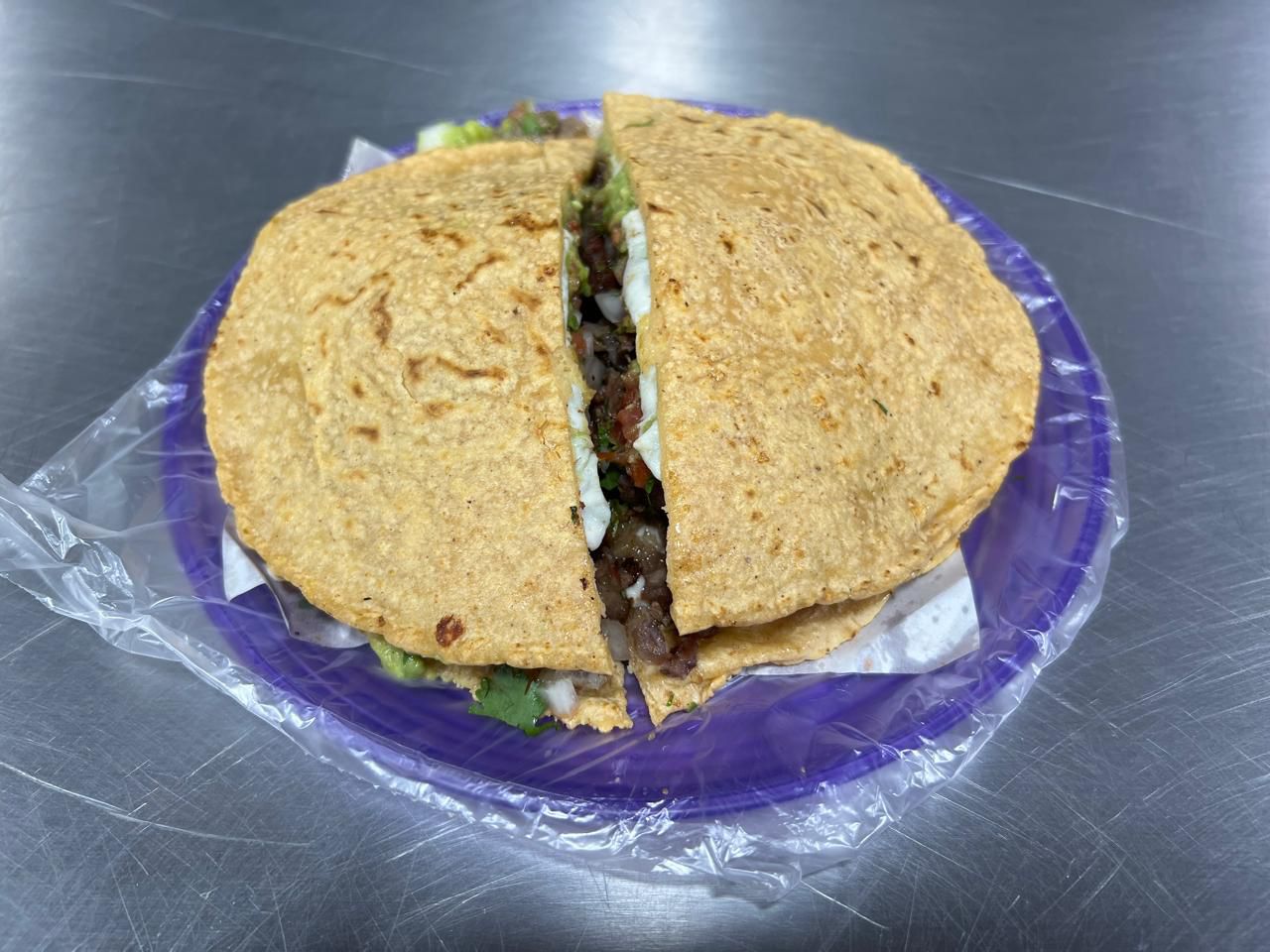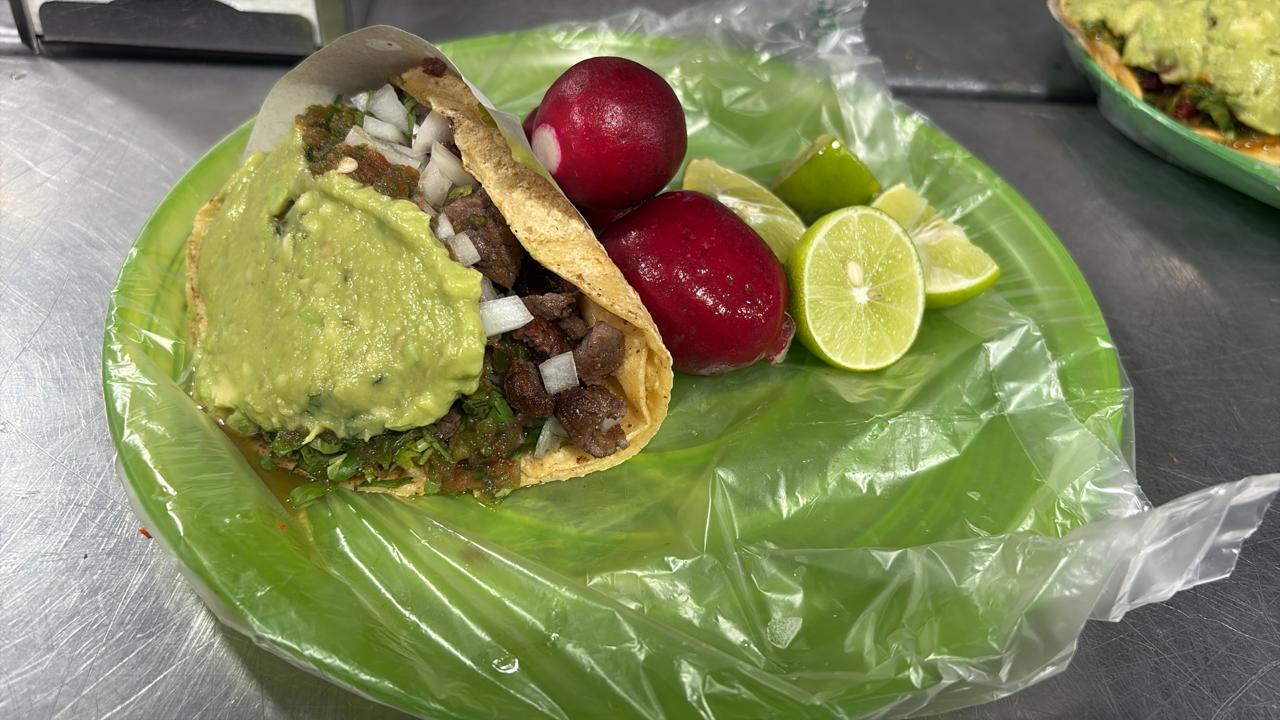 1/4 carne adobada cuenta con tortillas, cilantro, cebolla,salsa, aguacate, cebolla cocida,ensalada,