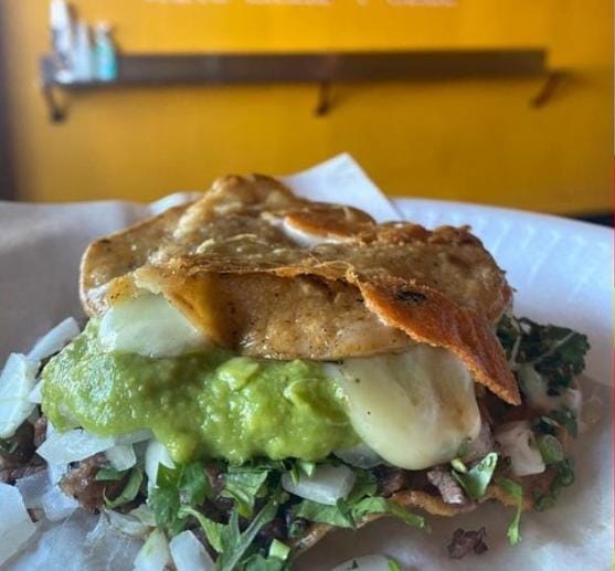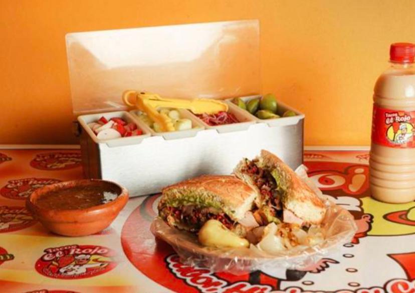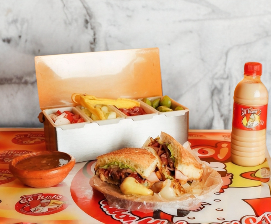 Pan Telera con mayonesa, chorizo, jamón, queso fundido, cebolla, cilantro, salsa y guacamole.