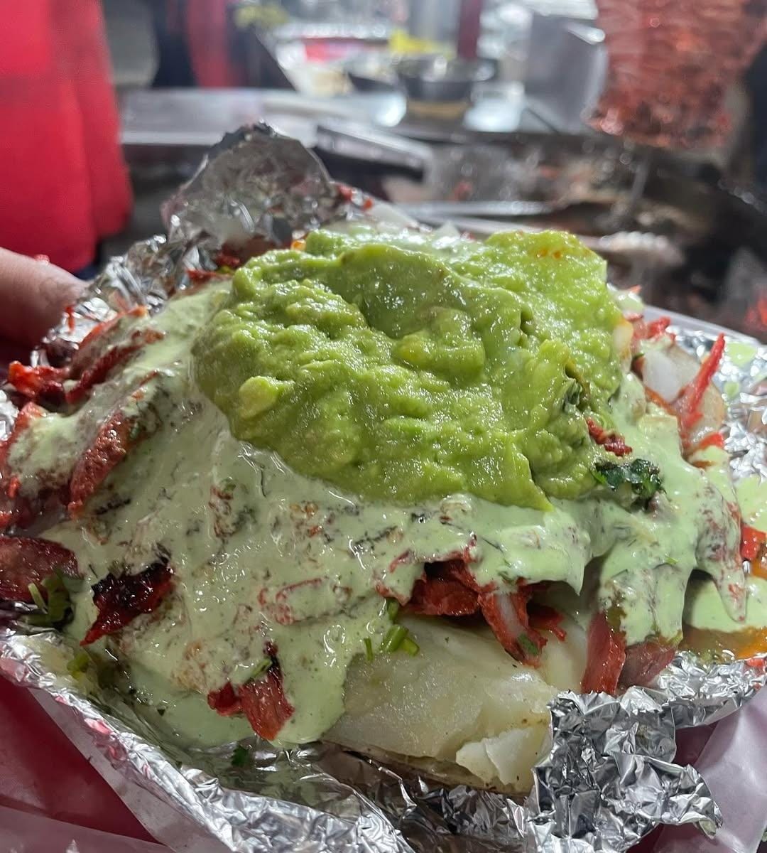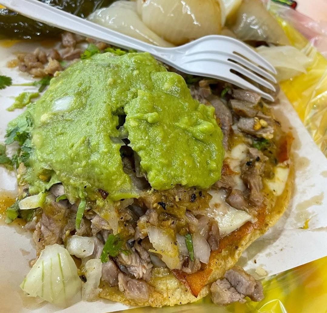 Taco de Adobada con Cebolla, Cilantro, Salsa y Guacamole