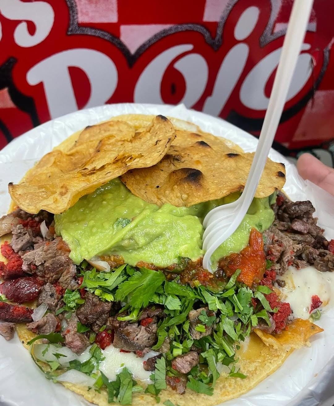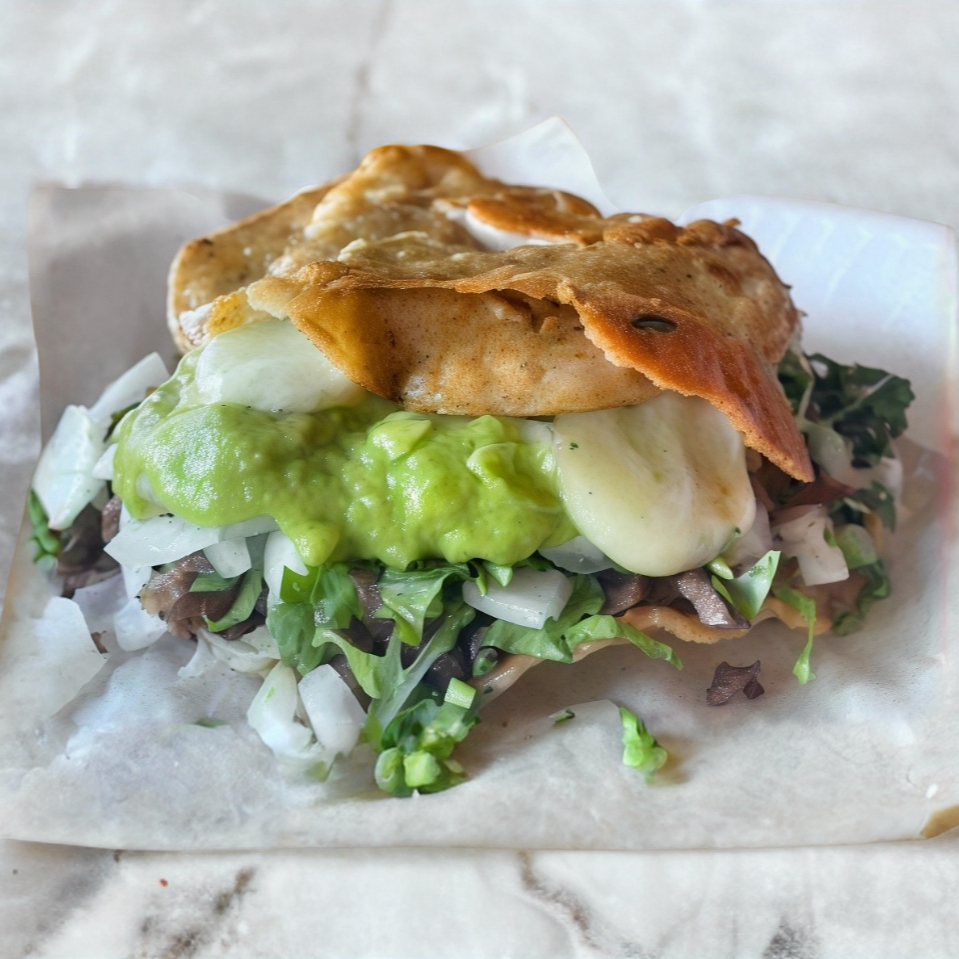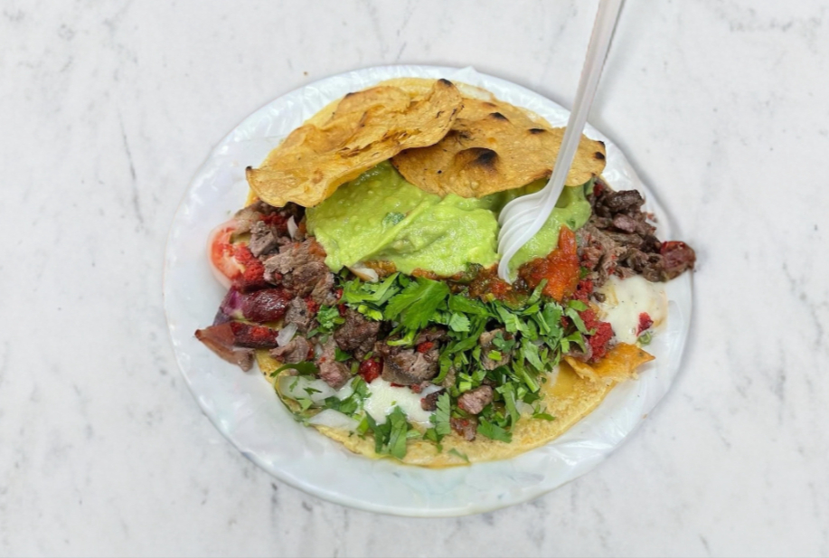 Doble Tostada con Carne Asada, Cebolla, Cilantro, Salsa y Guacamole