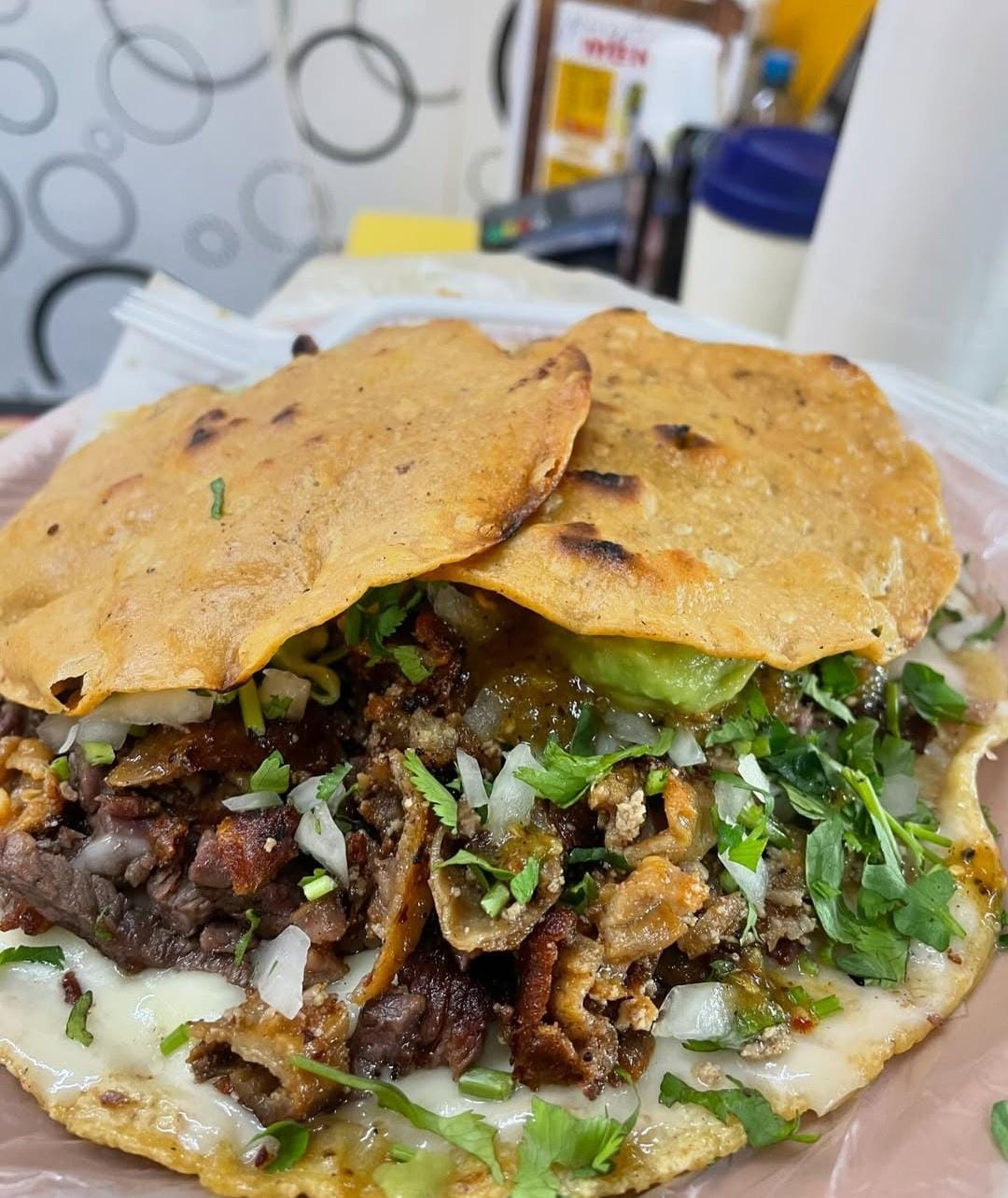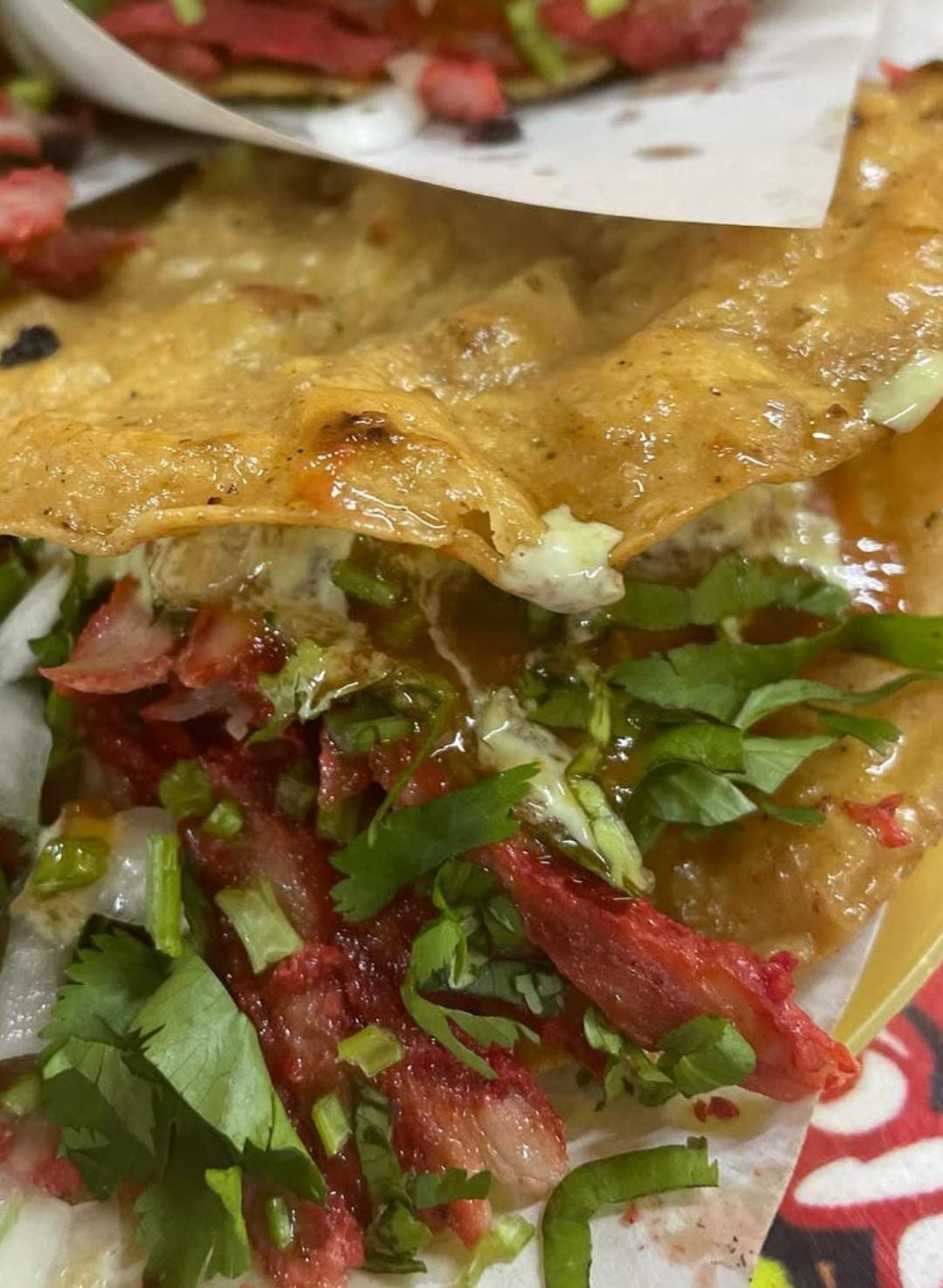 Doble Tostada con Carne Adobada, Cebolla, Cilantro y Salsa.