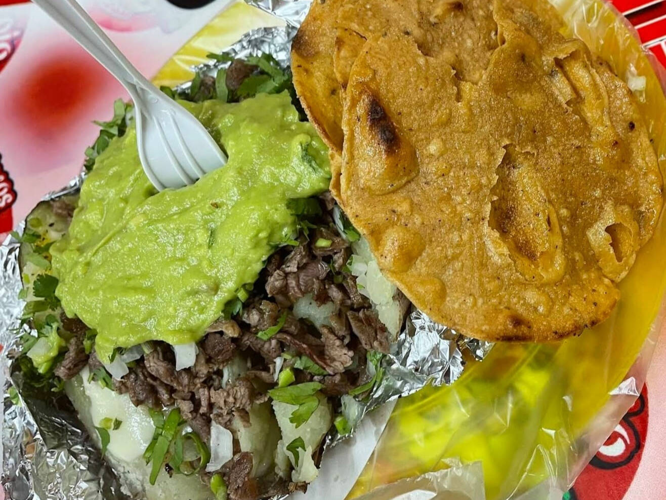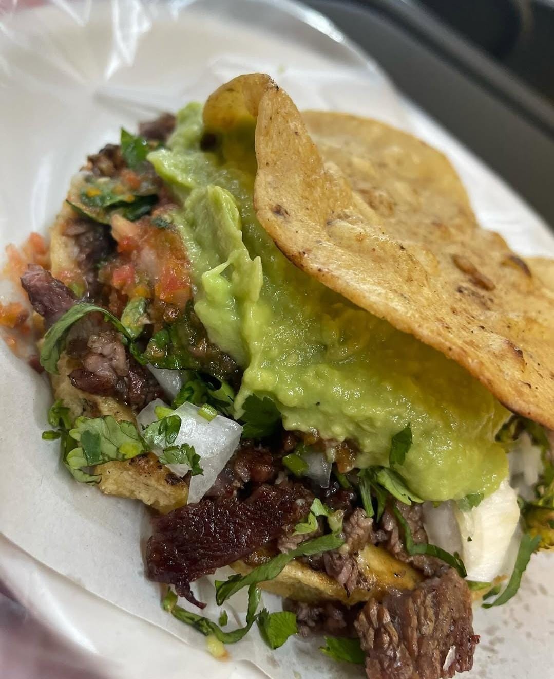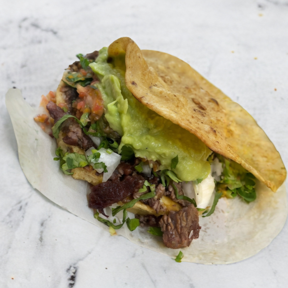 Taco de Carne Asada con Cebolla, Cilantro, Salsa y Guacamole