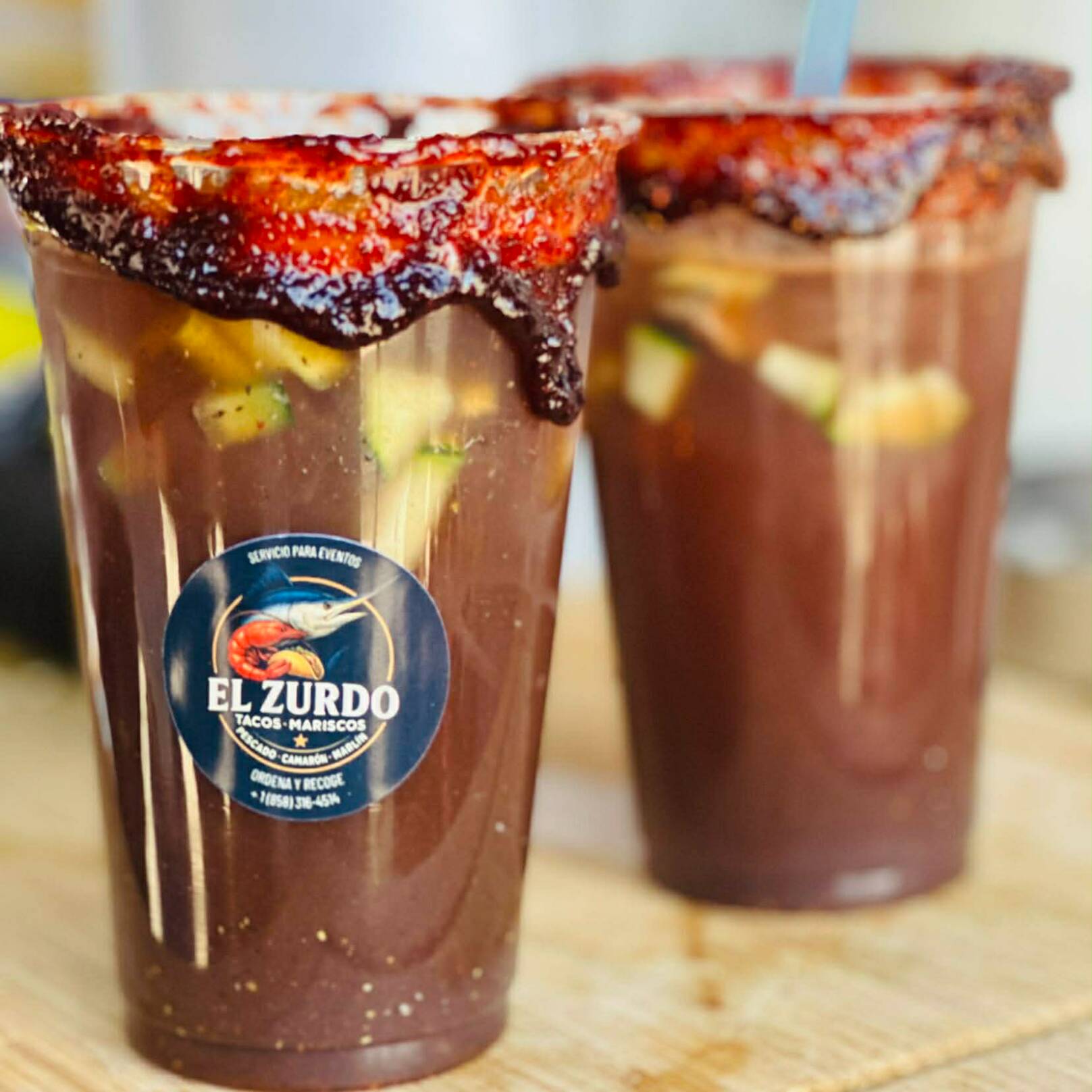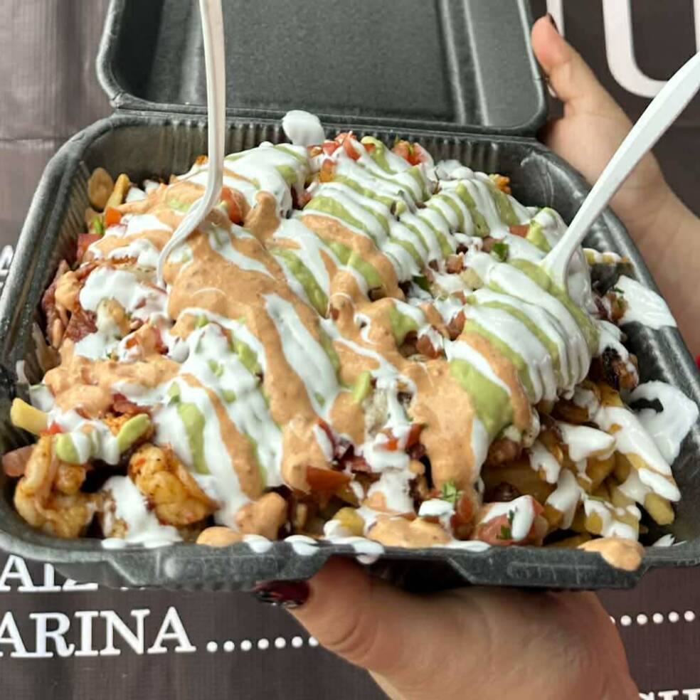 Contiene papas fritas,camarón enchilado,Tocino,carne de res,aguacate,repollo,tomate con cilantro y cebolla morada,los aderezos se los ponemos aparte.