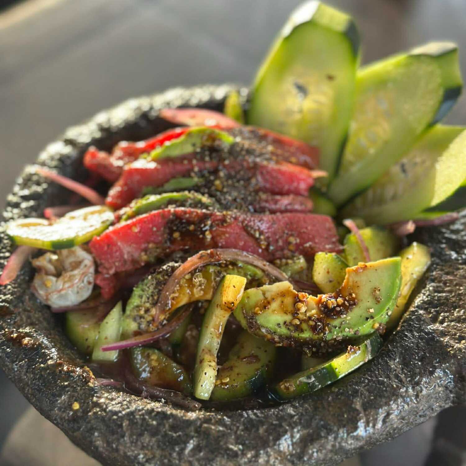 Orden de aguachile con salsa de la casa, y contiene pulpo y atún