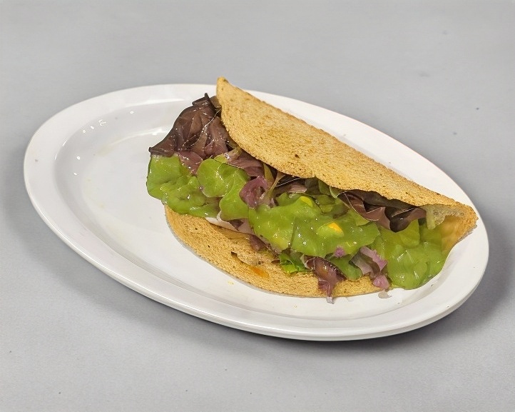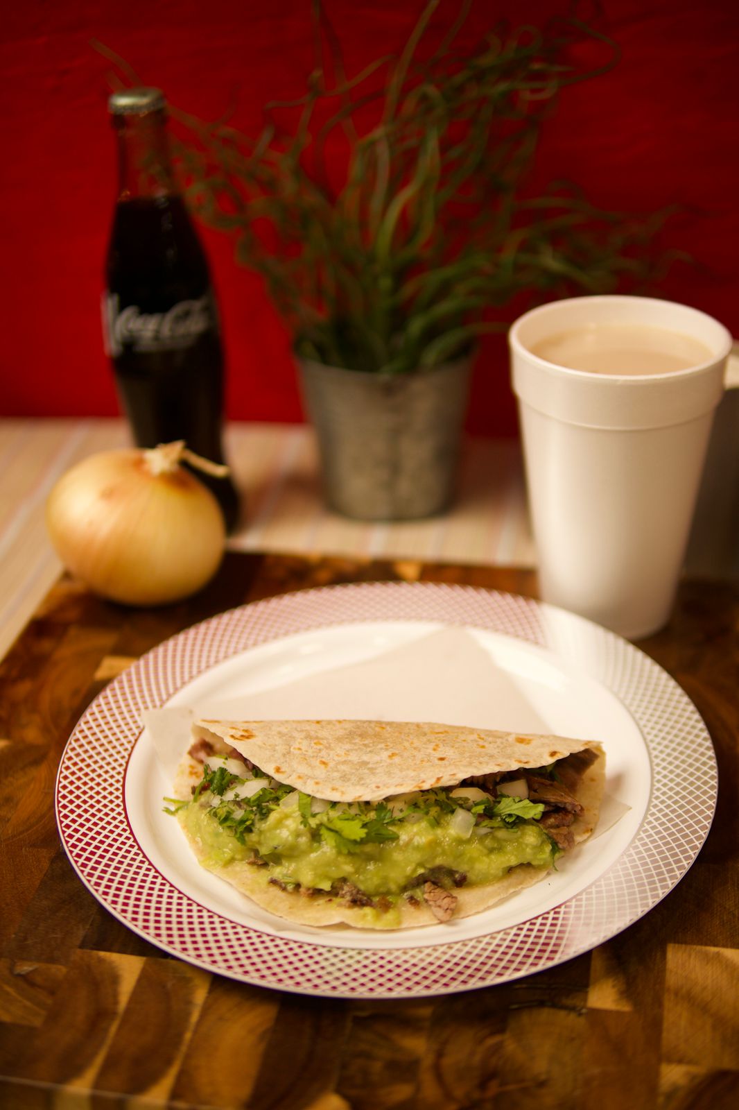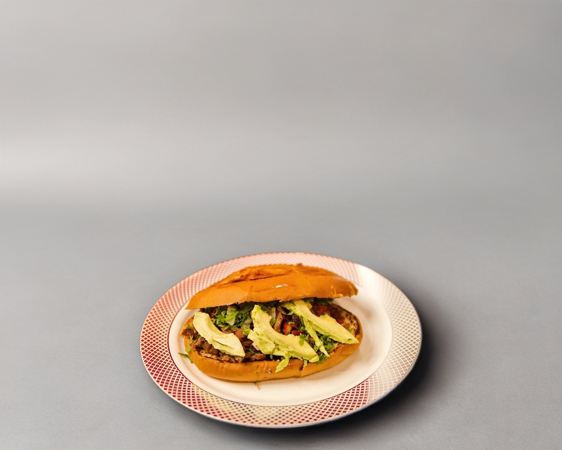 Torta adobada (carne, cebolla, cilantro y aderezo aguacate o crema opcional).