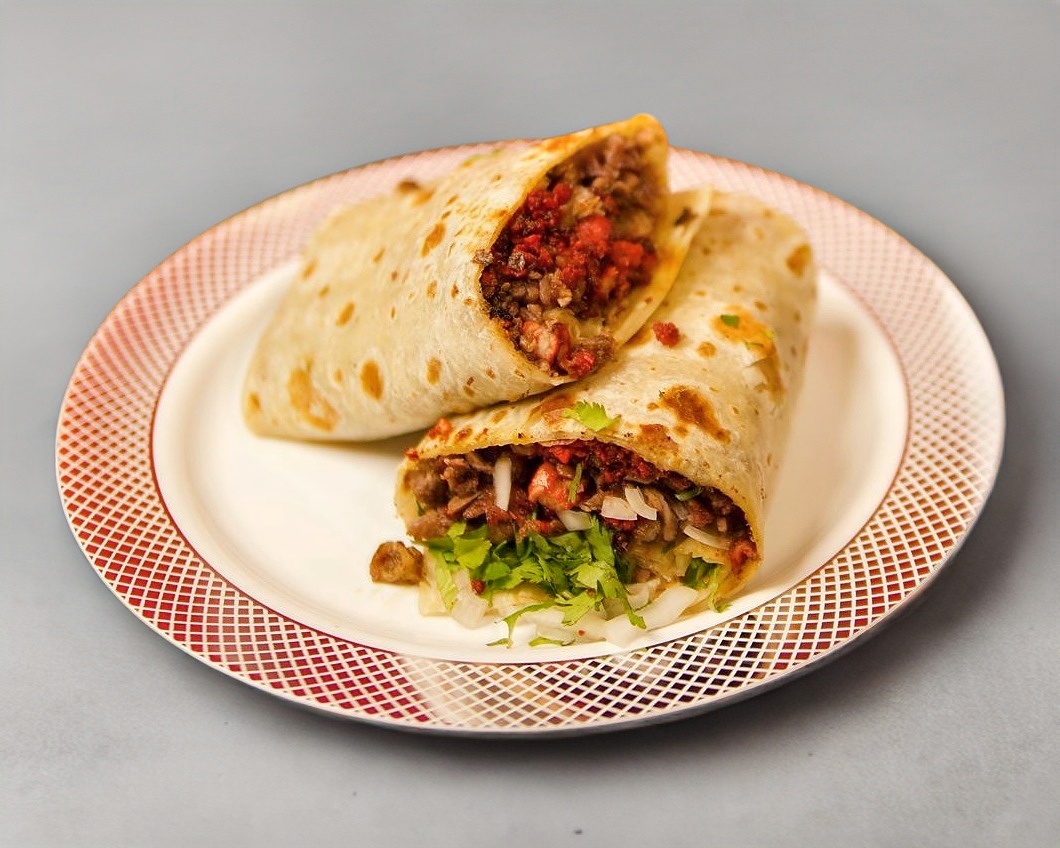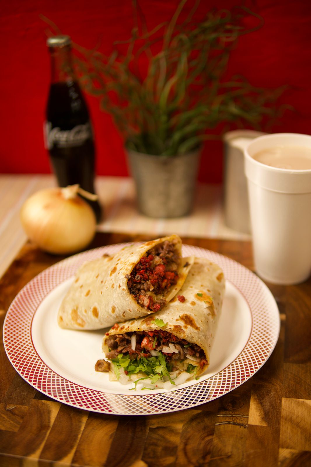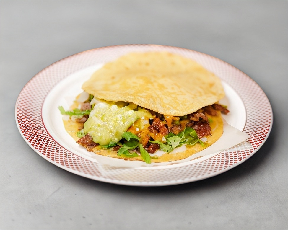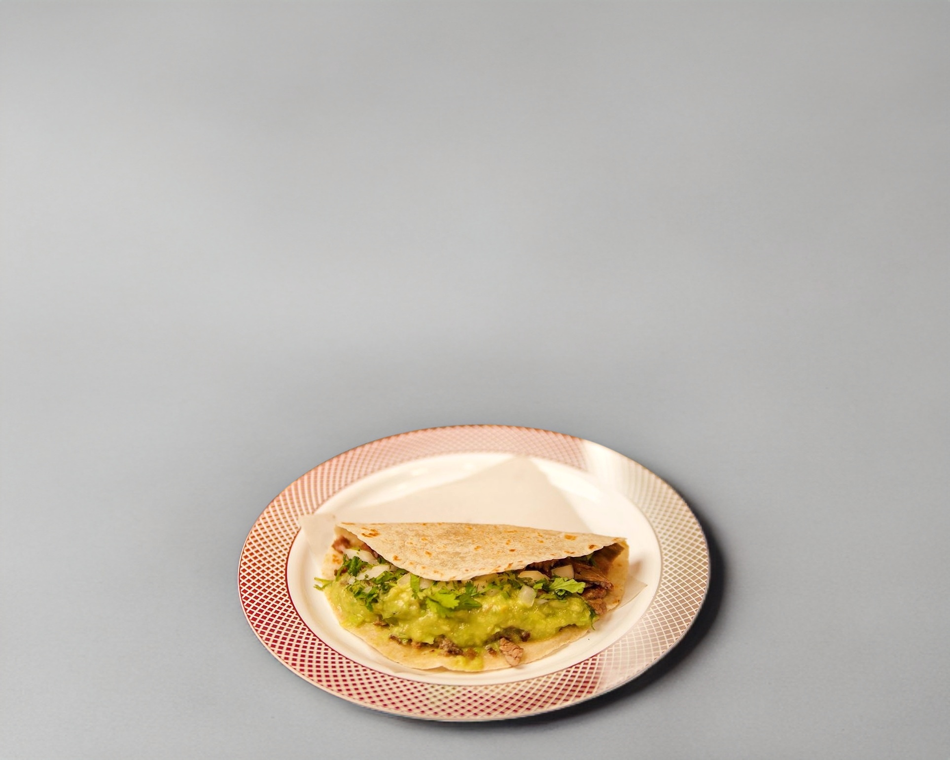 Plato personal, elección de 2 carnes. Cilantro, cebolla, frijol, aguacate, aderezo, salsa o crema.