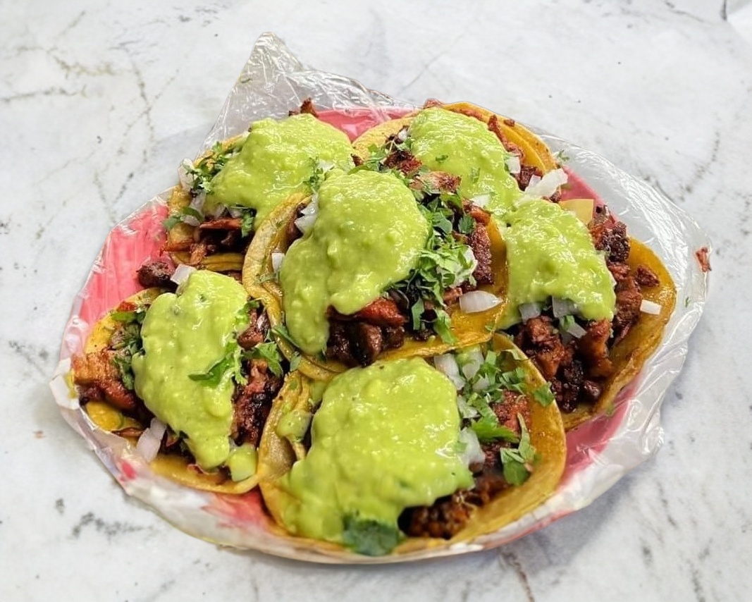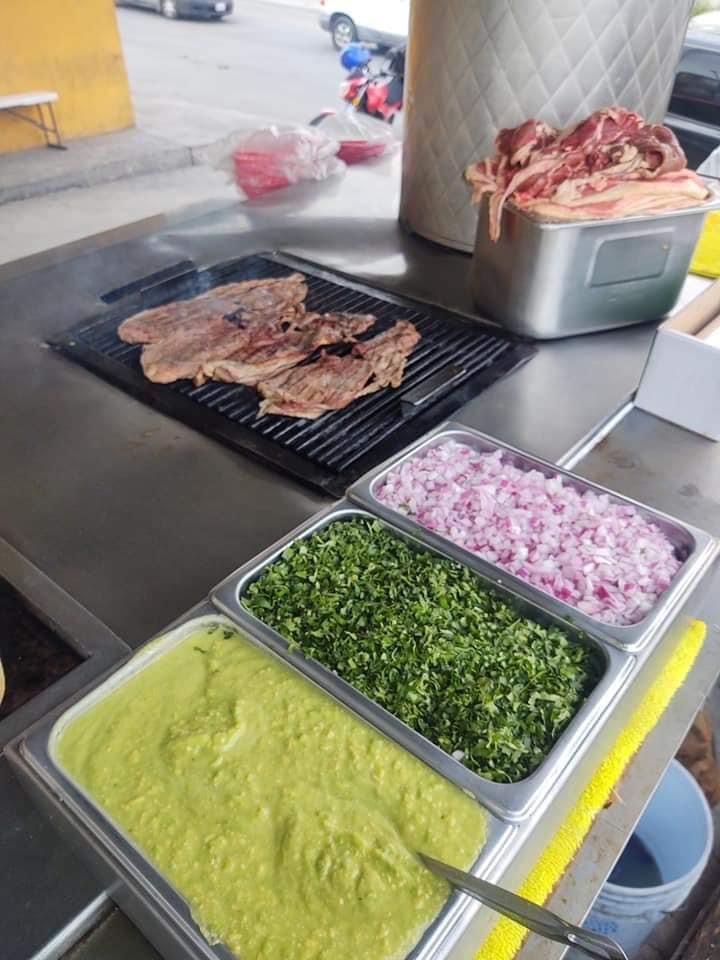 Tortilla de harina, carne asada y adobada, cebolla cilantro y aguacate