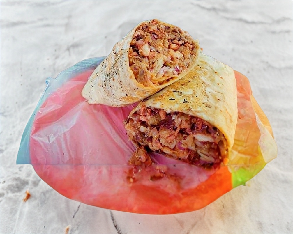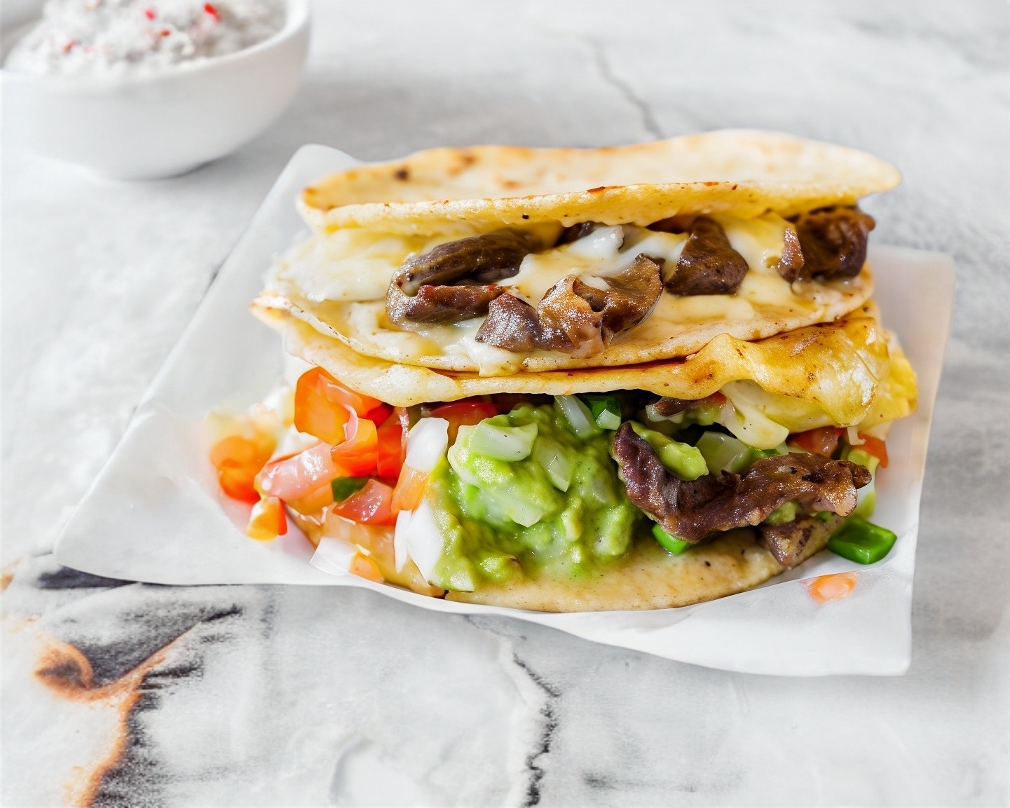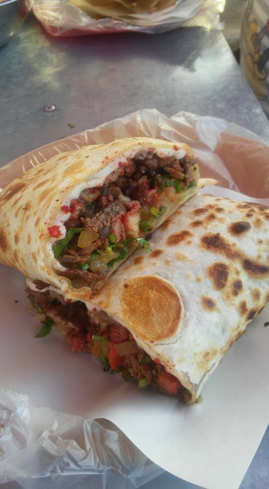 Tortilla de harina, carne adobada, cebolla, cilantro y aguacate.