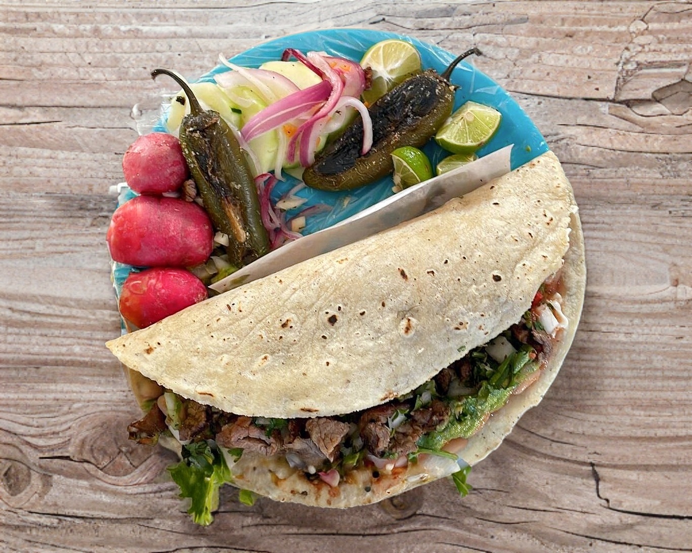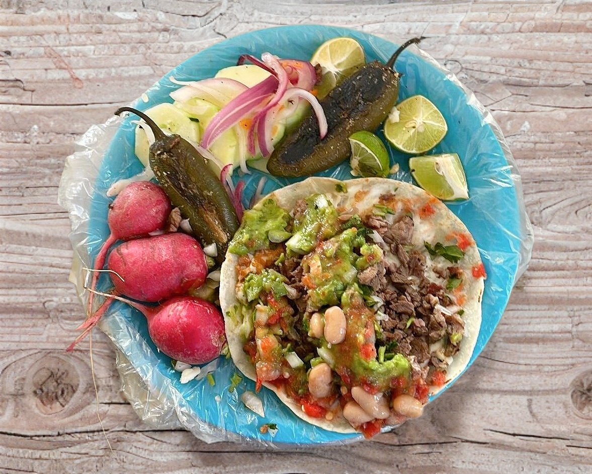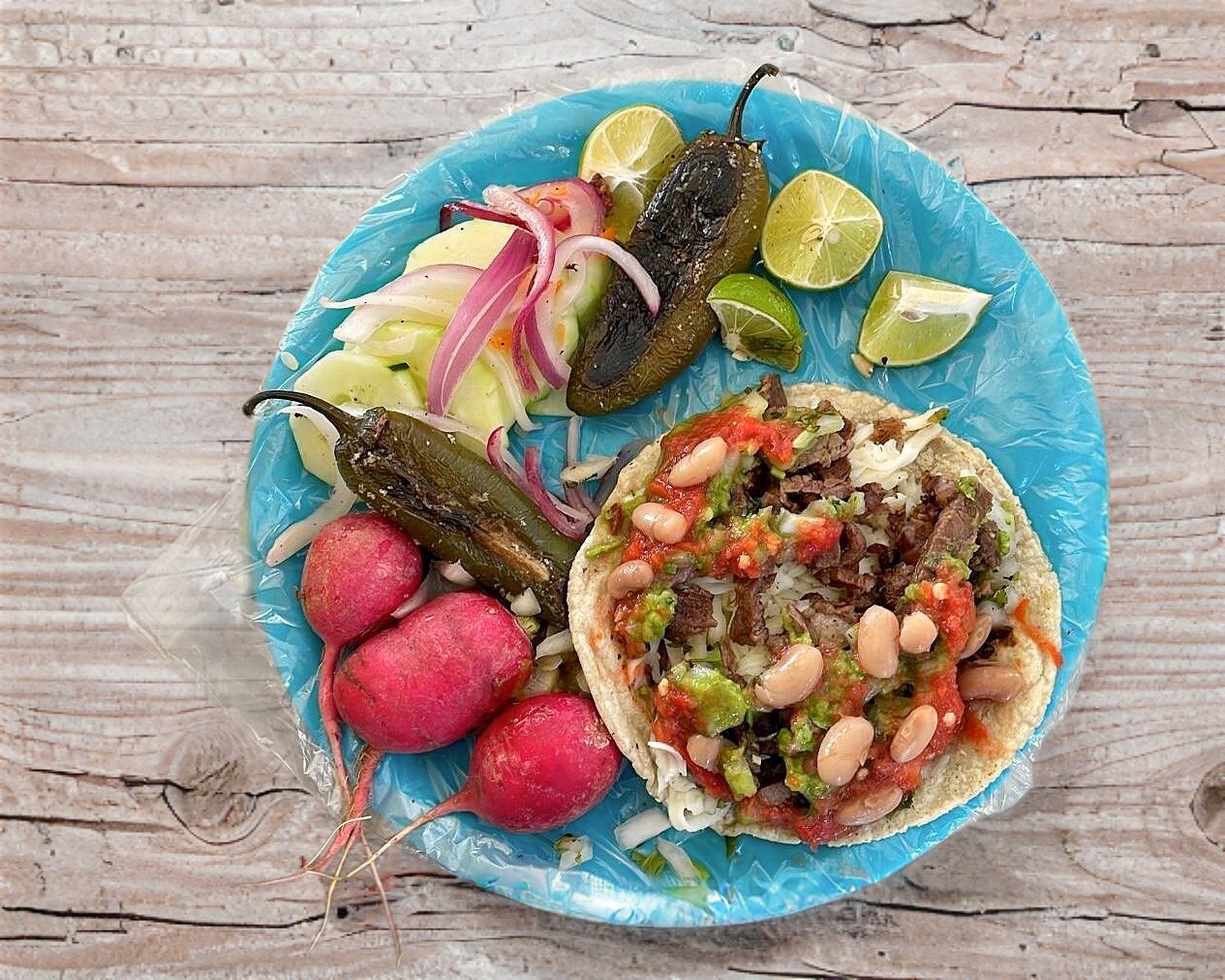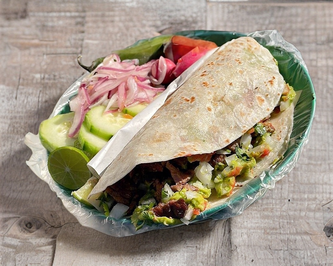 Carne de res, frijol, cebolla, cilantro, guacamole y salsa.