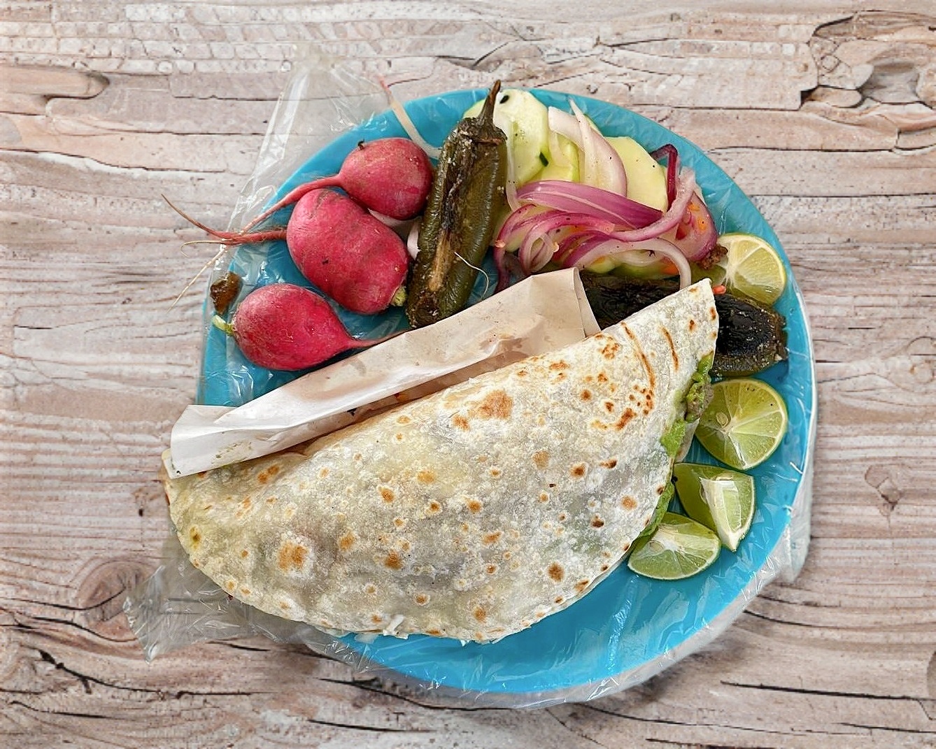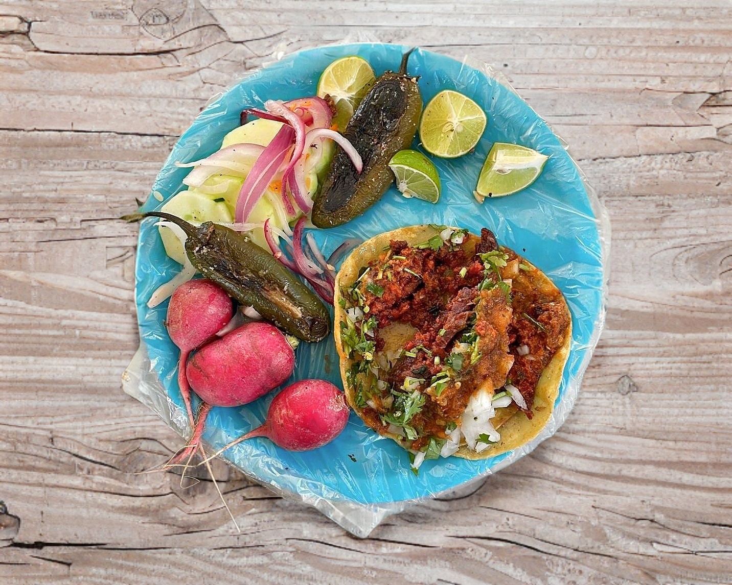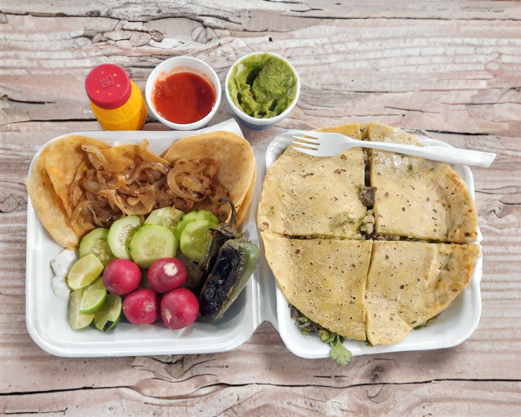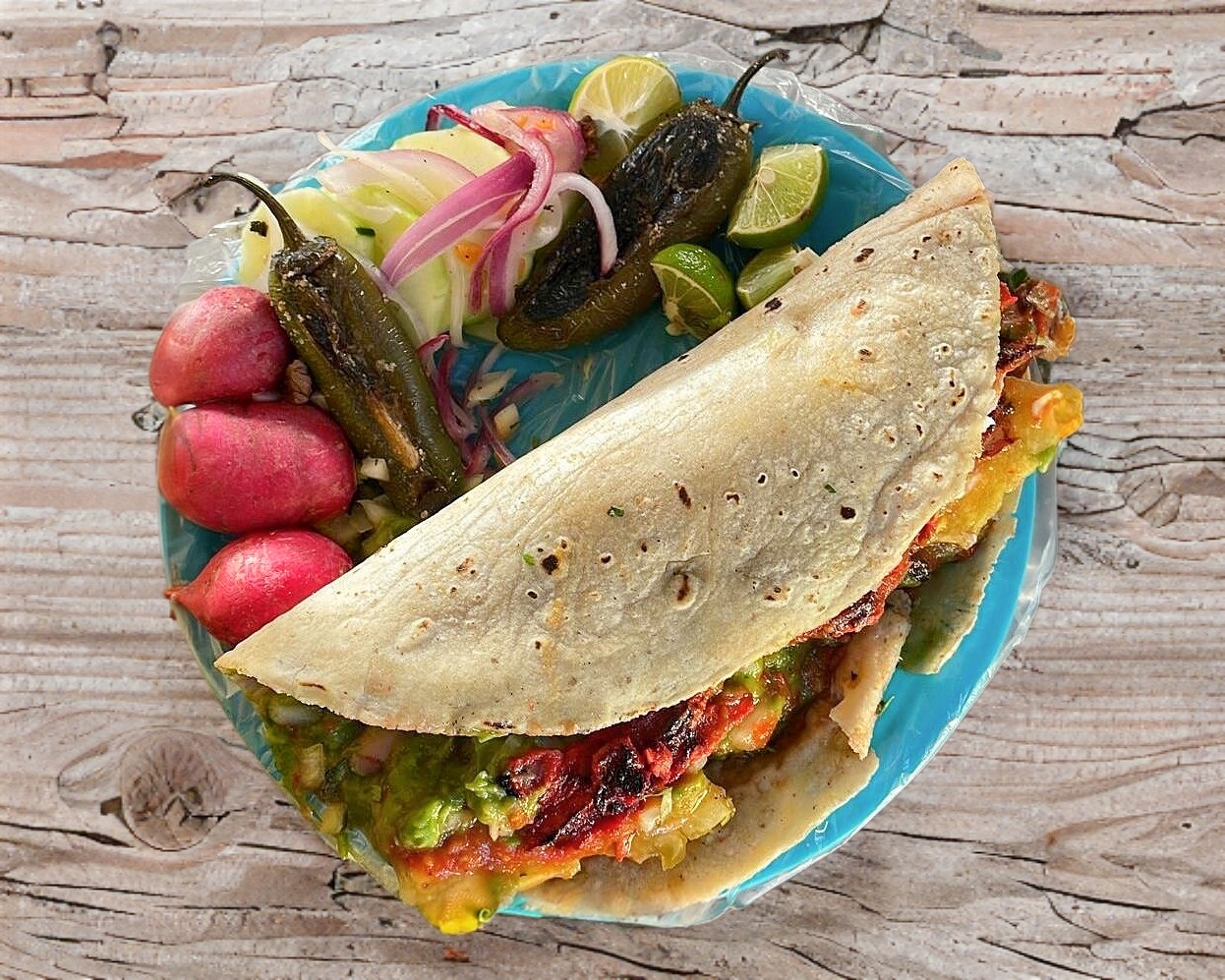 Carne de res, frijol, cebolla, cilantro, guacamole y salsa.