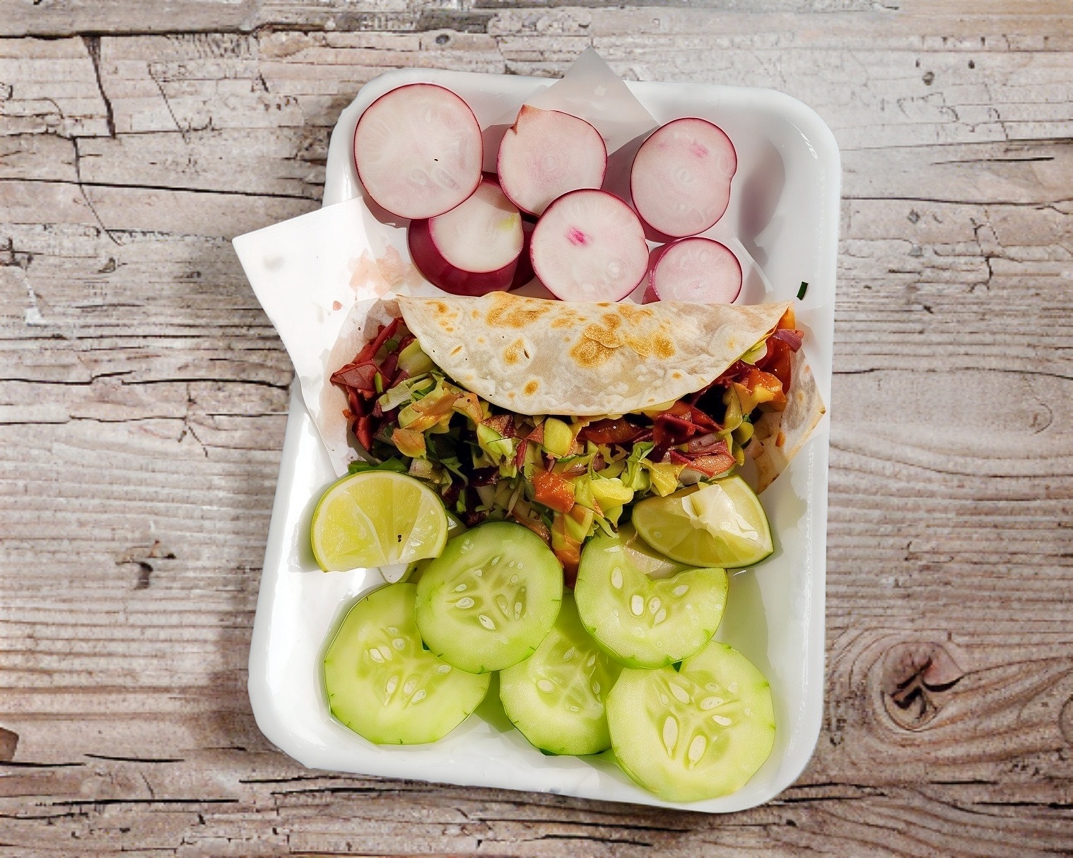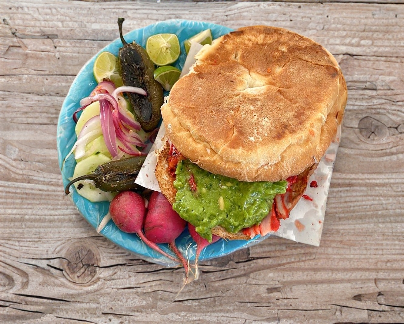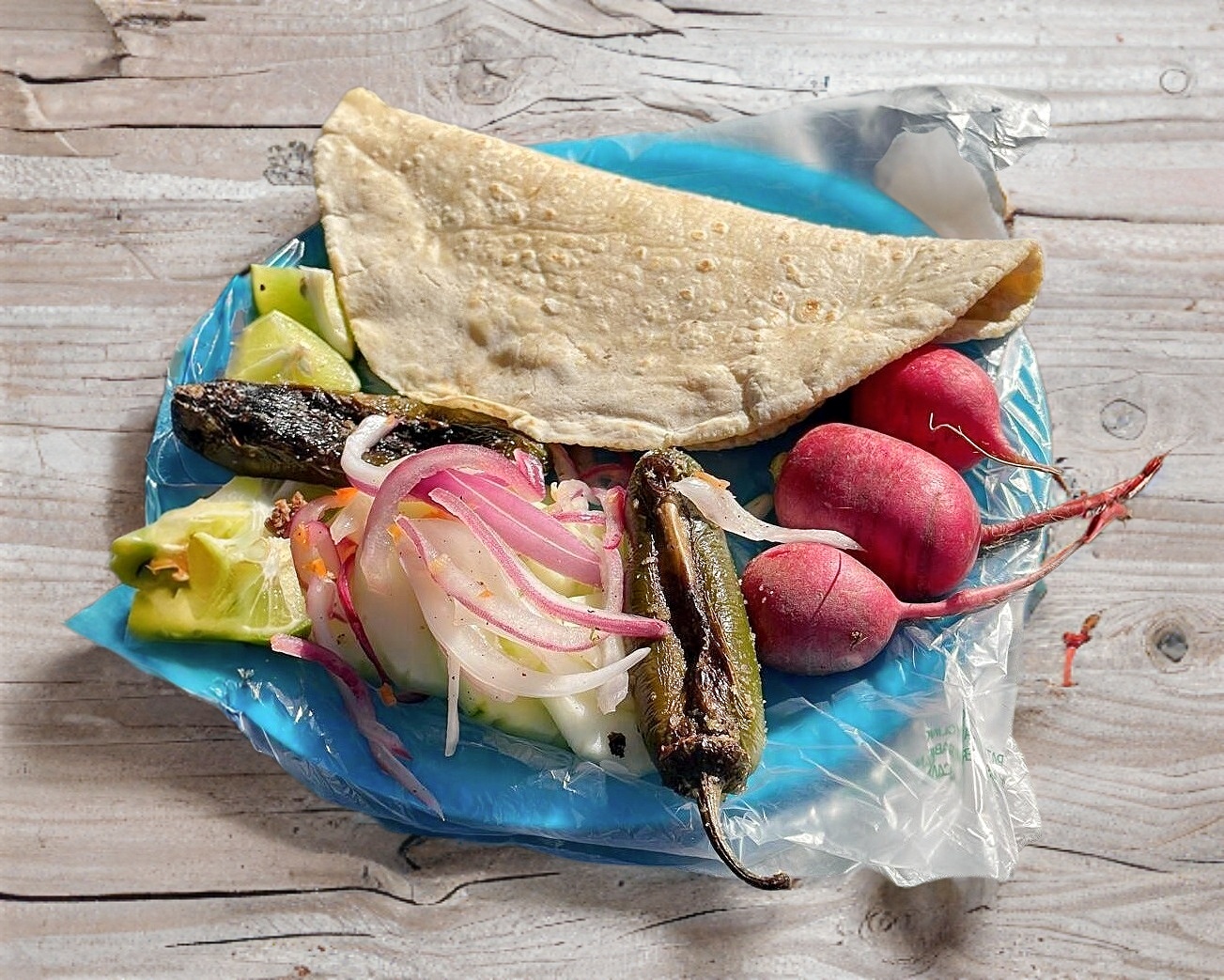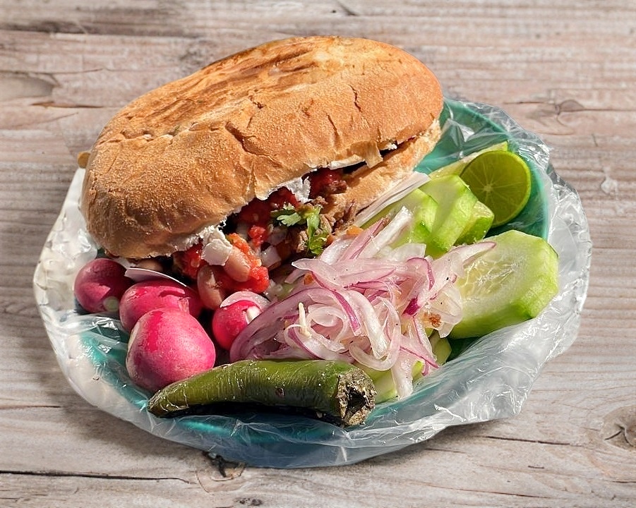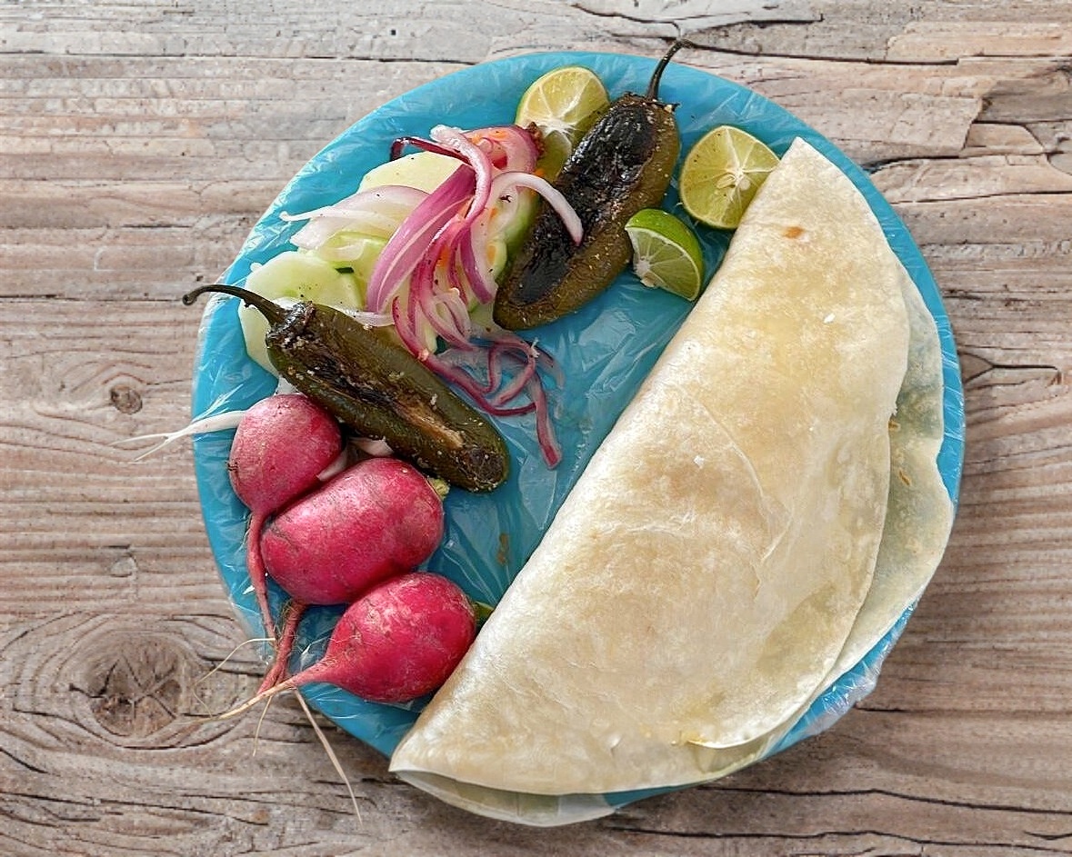 Carne de res, frijol, cebolla, cilantro, guacamole y salsa.