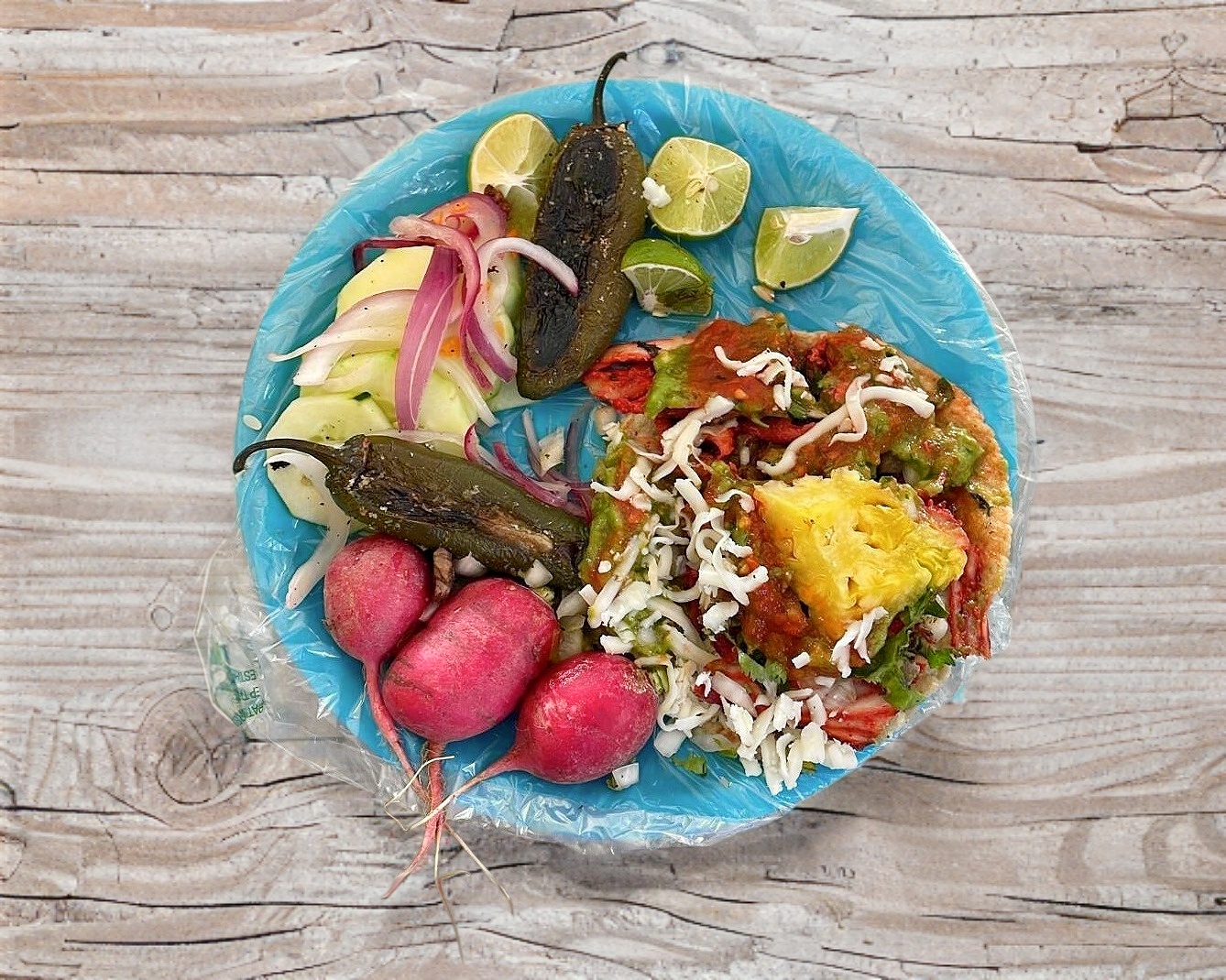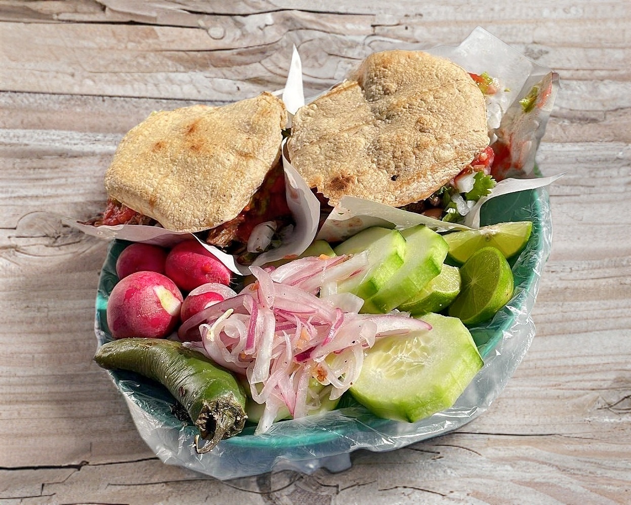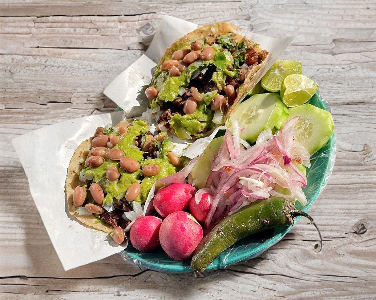 Orden campechana con 2 carnes de su elección: asada, adobada, chorizo, suadero, cabeza. Acompañada de cebolla, cilantro, salsa, guacamole y tortillas.