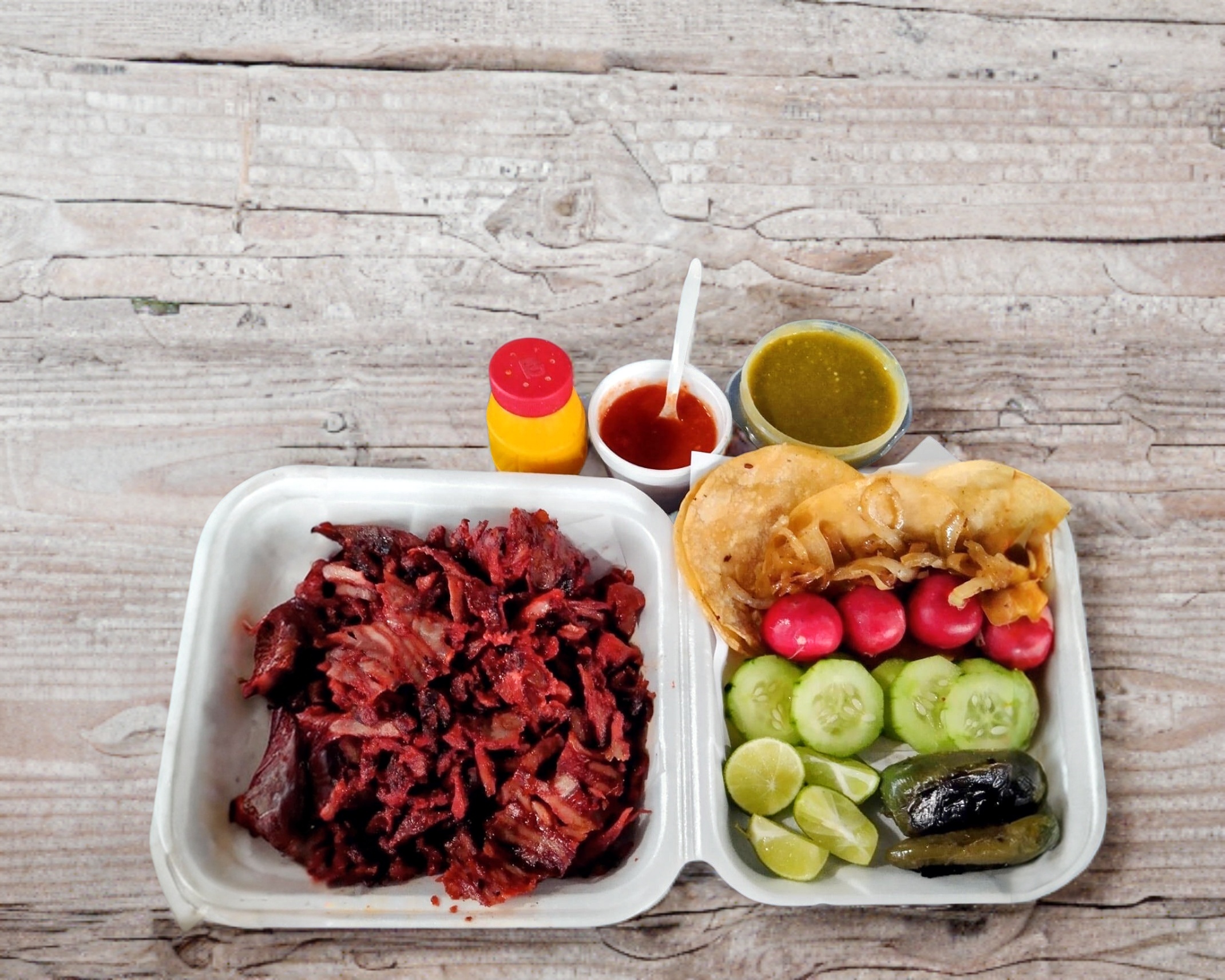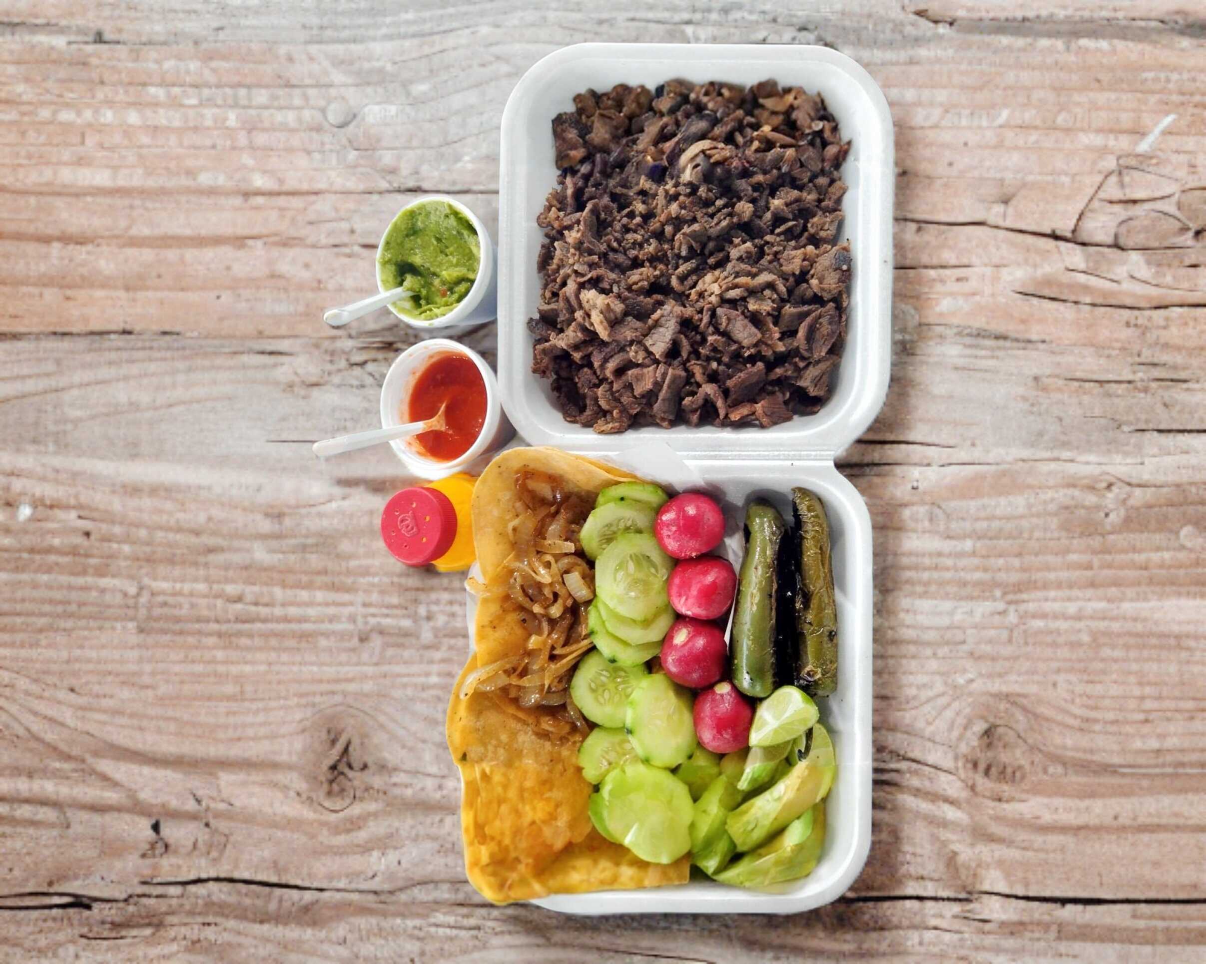 Orden de carne de su elección: asada, adobada, chorizo, cabeza, suadero. Acompañada de cebolla, cilantro, salsa, guacamole y tortillas aproximadamente 10 unidades. Para 4 o 5 personas.