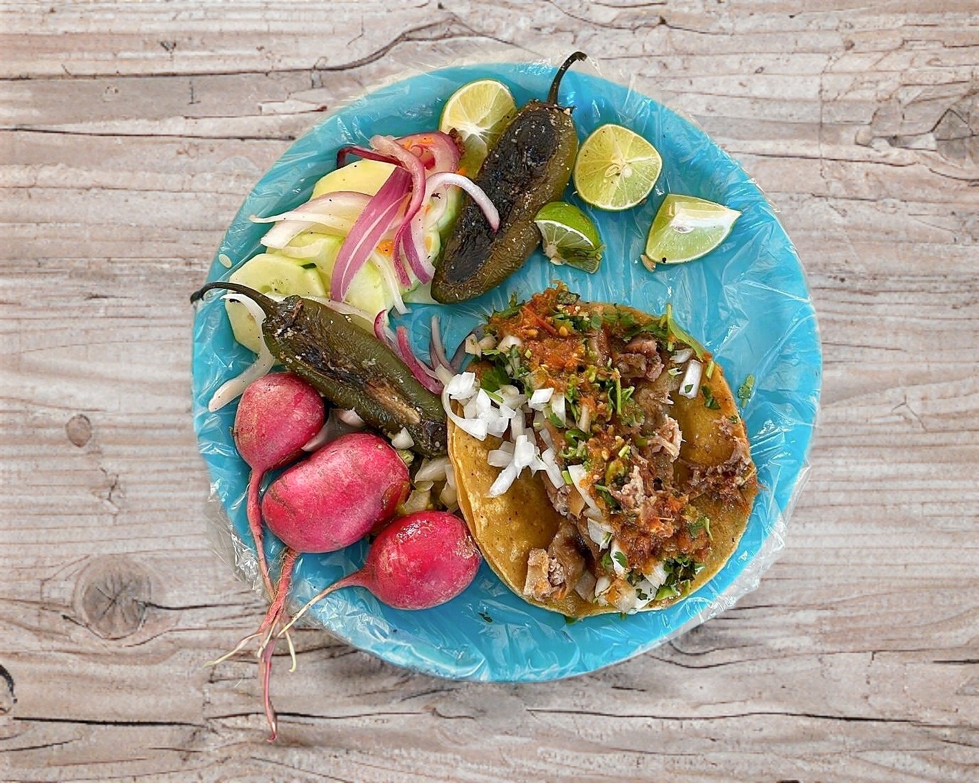Carne de puerco, cebolla, cilantro, guacamole y salsa.