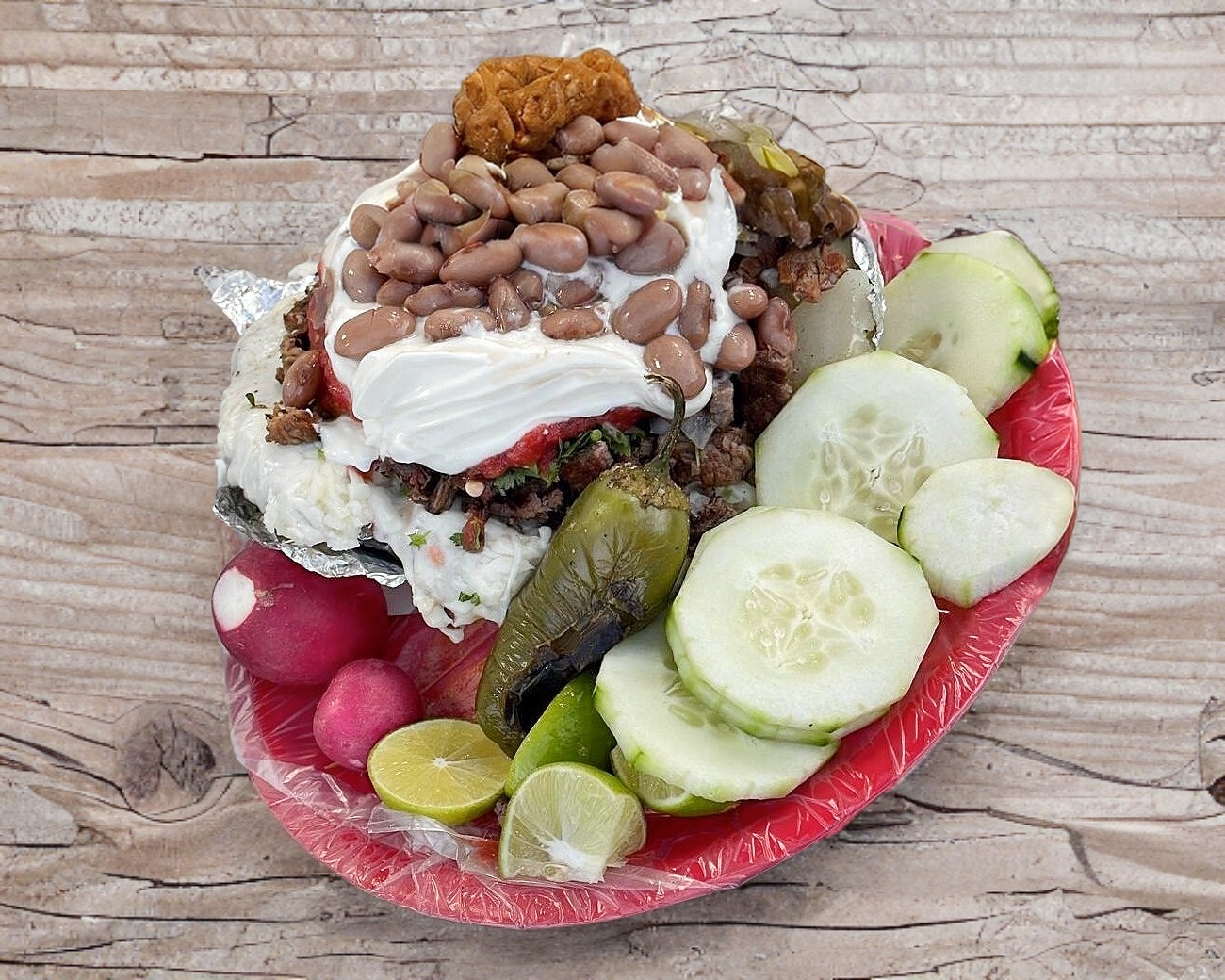 Papa rellena de carne de res, queso, mantequilla, frijol, cebolla, cilantro, guacamole, salsa y crema agria.