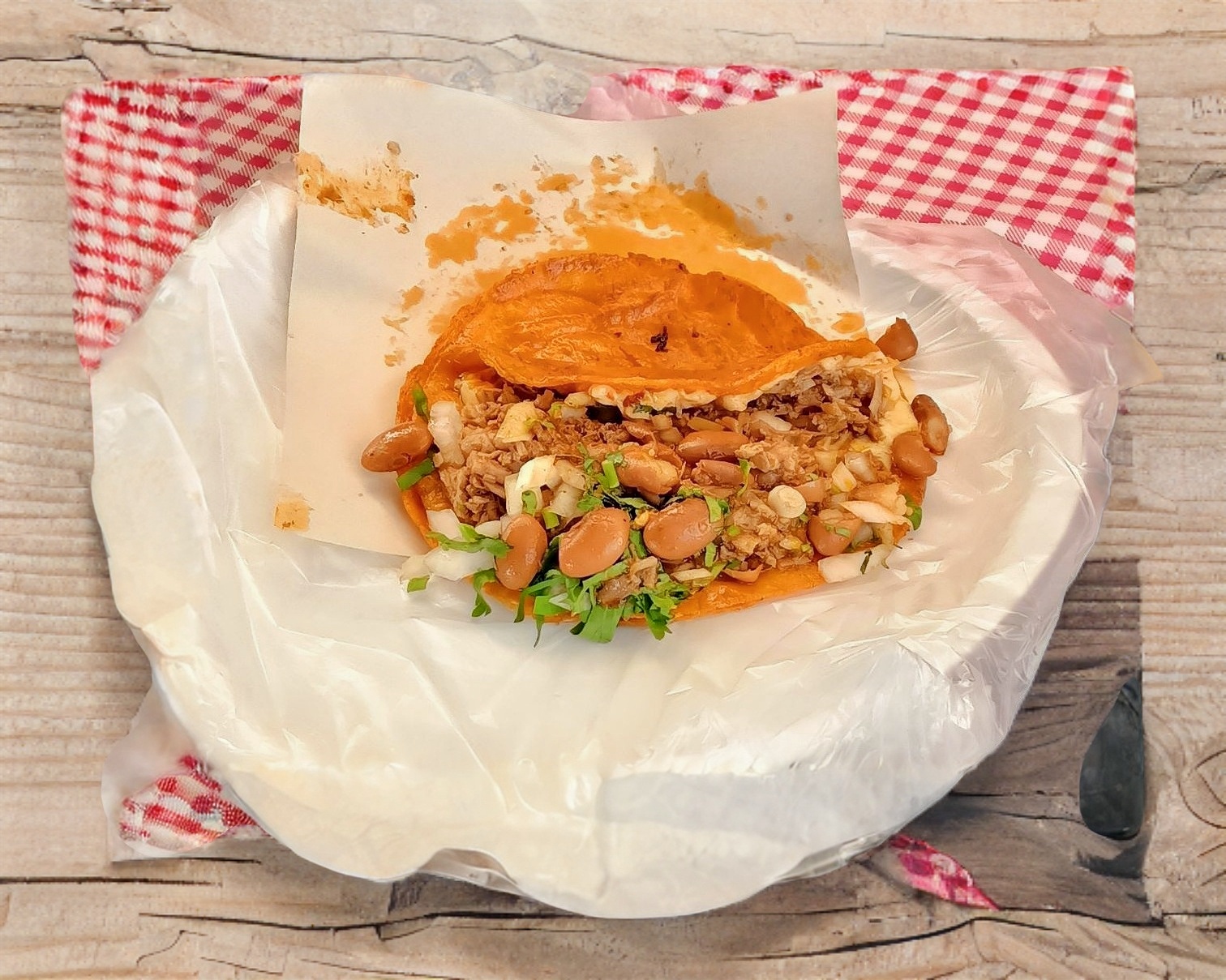 Riquísimo taco, prepáralo a tu gusto, cebolla, cilantro, salsa y frijoles.
