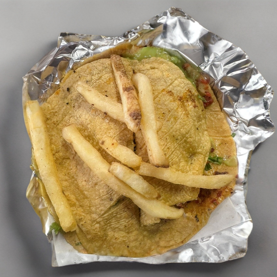 Doble tortilla de harina preparada con queso y la proteína de tu eleccion acompañada con papas fritas