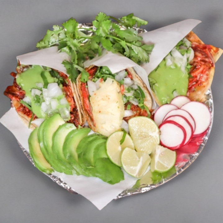 Delicisos tacos con carne de puerco adobada acompañados con piña, aguacate, cilantro, cebolla y salsa