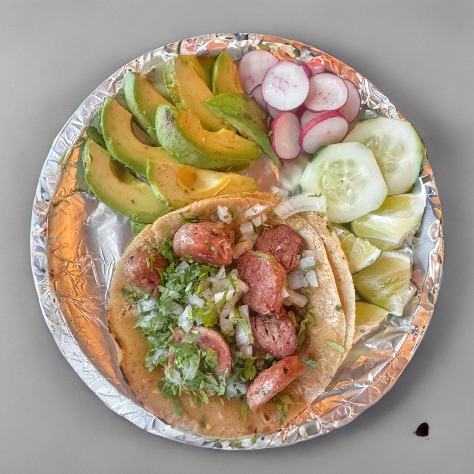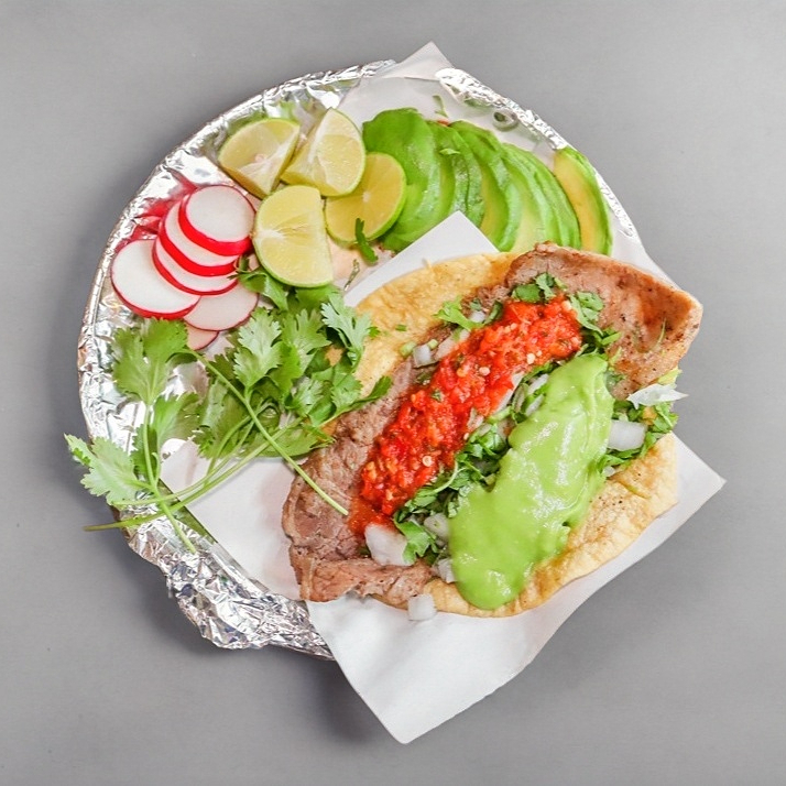 Doble tortilla dorada preparada con carne adobada, cilantro, cebolla, salsa y aguacate