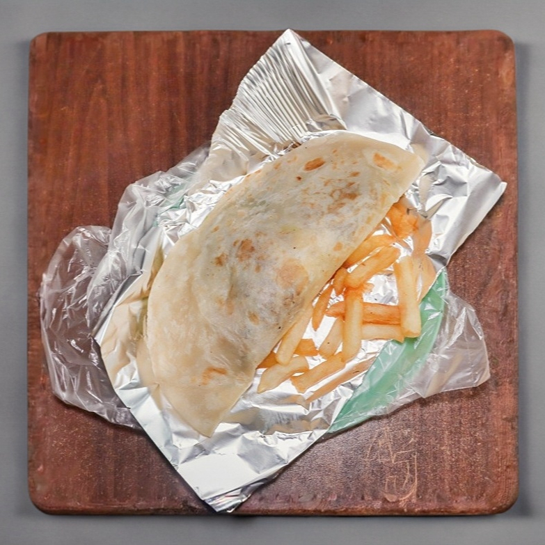 Tortilla de harina grande rellena de queso y carne adobada, acompañada de papas fritas