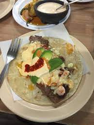 Carne asada, trozo de nopal, aguacate, salsa y queso gratinado
