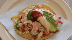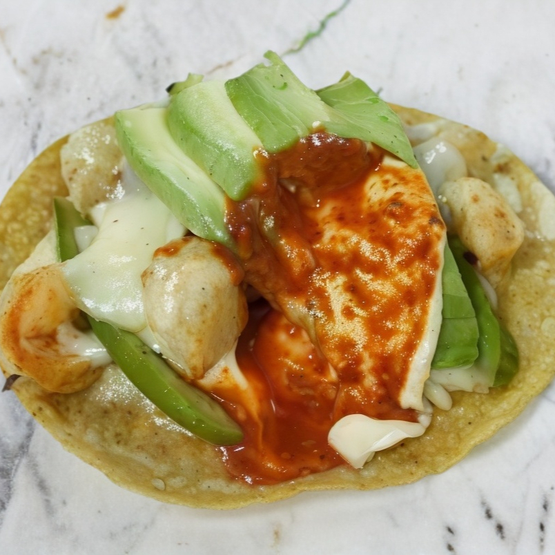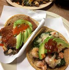 Este taco de camarón está elaborado con tortilla recién hecha a mano agregamos camarón ala plancha lo terminamos con queso champiñones salsa morita aguacate colegiado y sin faltar el aderezo de la casa